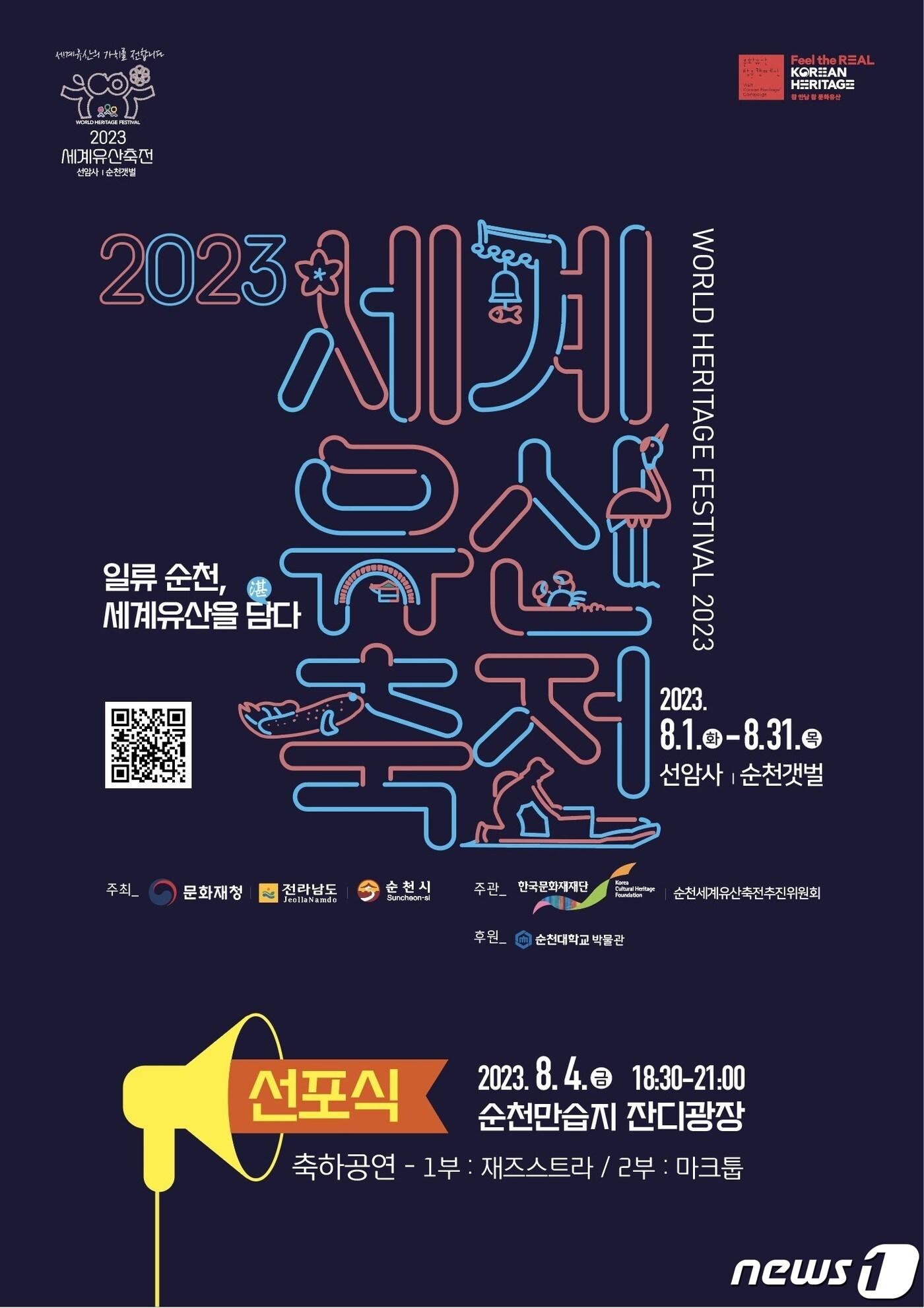 8월31일까지 공연·전시·체험 다채'2023 세계유산축전-선암사·순천갯벌' 선포식 홍보 포스터.(순천시 제공)2023.8.2/뉴스1관련 키워드순천세계유산축전선암사선포식관련 기사[오늘의 주요일정] 정치·정부 (12일, 금)세계유산축전 선암사·순천갯벌 12일 그린아일랜드서 개막'아날로그와 디지털의 만남'…세계유산축전 선암사·순천갯벌'세계유산축전 선암사, 순천갯벌'…"지역 경제 활성화 선봉장"순천 선암사·갯벌 일원서 22일간 '세계유산축전' 열린다