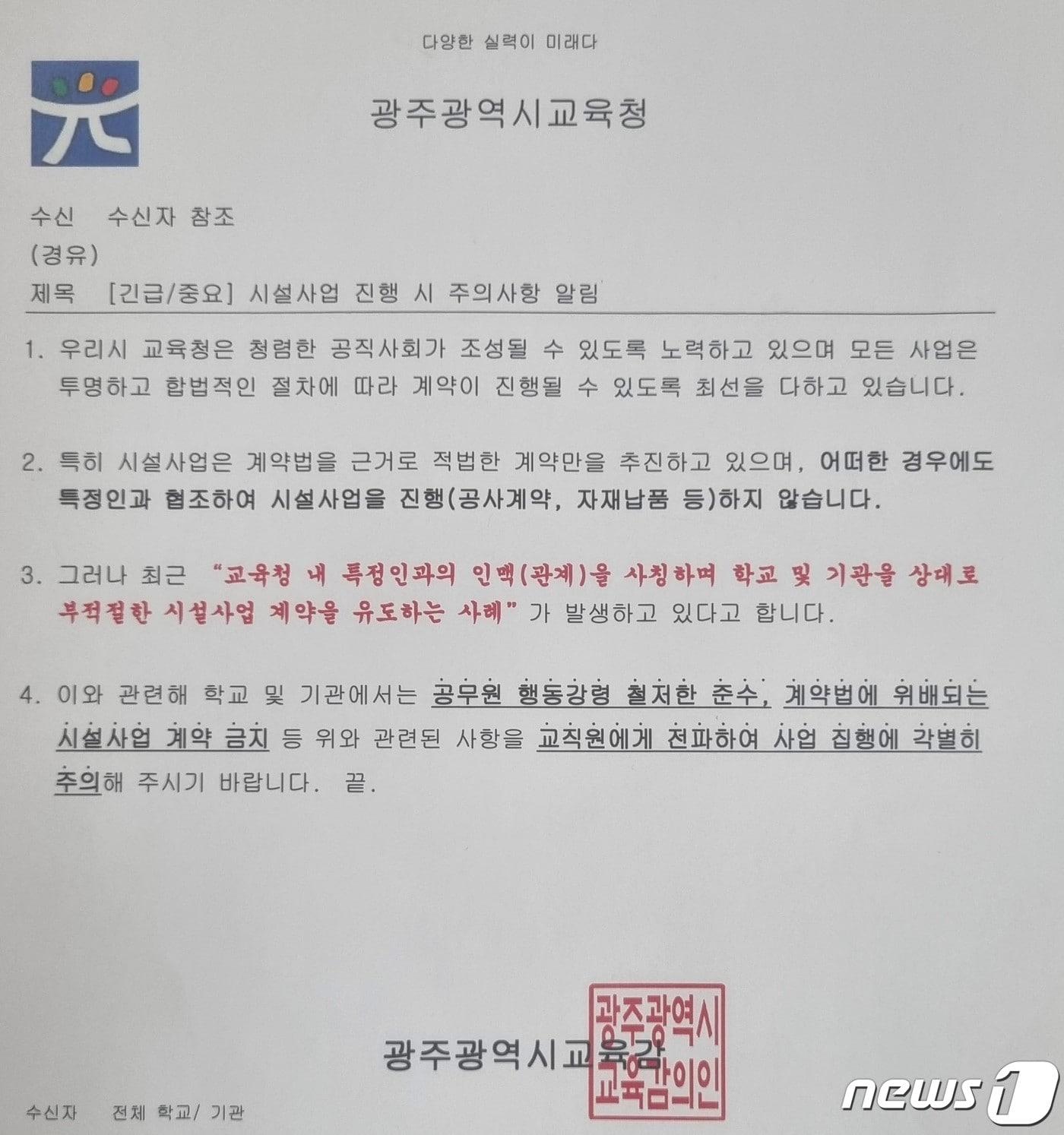 시교육청 "일선 학교 계약시 유의하라는 차원에서 보내"광주교사노조 "면피용 우려…공문 대신 비위 적발, 징계해야"광주시교육청이 10일 특정인과의 인맥을 사칭해 부적절한 시설사업 계약을 유도하는 사례를 주의하라는 공문을 일선 학교에 배포했다.(광주교사노동조합 제공)2023.10.25./뉴스1관련 키워드광주시교육청서충섭 기자 주말 광주·전남 지방선거 출마자들 대거 출판기념회이정선 광주교육감 17일 조선대서 출판기념회관련 기사"광주전남특별시, 부교육감 3명·통합특별교육교부금 정부 지원도"광주 교사·공무원단체 "행정통합 따른 인사 불이익 없어야"[오늘의 주요일정] 광주·전남 (15일, 목)광주전자공고 적극행정 우수사례…공사비 6억 기부채납 협약'광주전남특별시' 이전 임용 공무원, 종전 관할구역서 근무