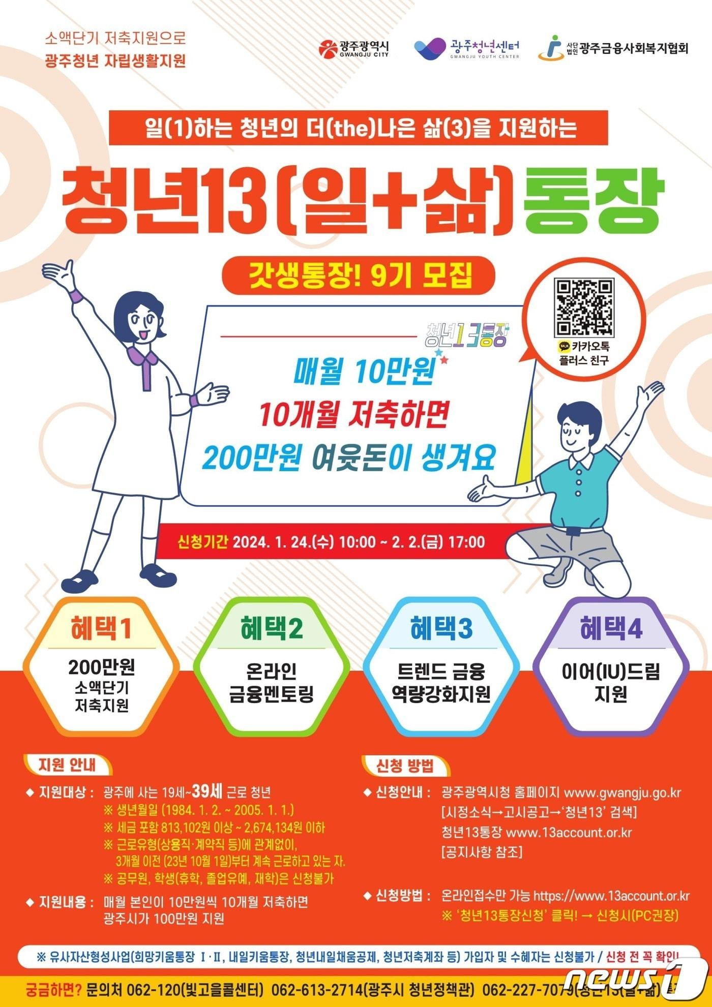 지역청년 10개월 간 100만원 저축때 광주시 100만원 추가제공총 610명 대상 참여자 모집…24일∼2월2일 온라인 접수청년13(일+삶)통장 9기 참여자 모집 포스터(광주시 제공) 2024.01.17/뉴스1관련 키워드청년13(일+삶)통장박중재 기자 "'극한 기후' 예비군 훈련, 연기하거나 실내 훈련으로 전환해야"강기정, 李대통령 '타운홀미팅' 후폭풍에 "억울하고 섭섭했지만…"관련 기사100만원 저축하면 100만원 더…접속량 폭주로 서버 다운100만원 저축하면 100만원 더…광주시 '청년 일+삶 통장' 참여자 모집경남도 내년도 예산 14조2845억원…올해보다 14.5%↑광주시, 대학 찾아가 초기 청년 정책 홍보"취약층 건강 챙긴다"…서울복지재단, KMI와 무료 검진 서비스