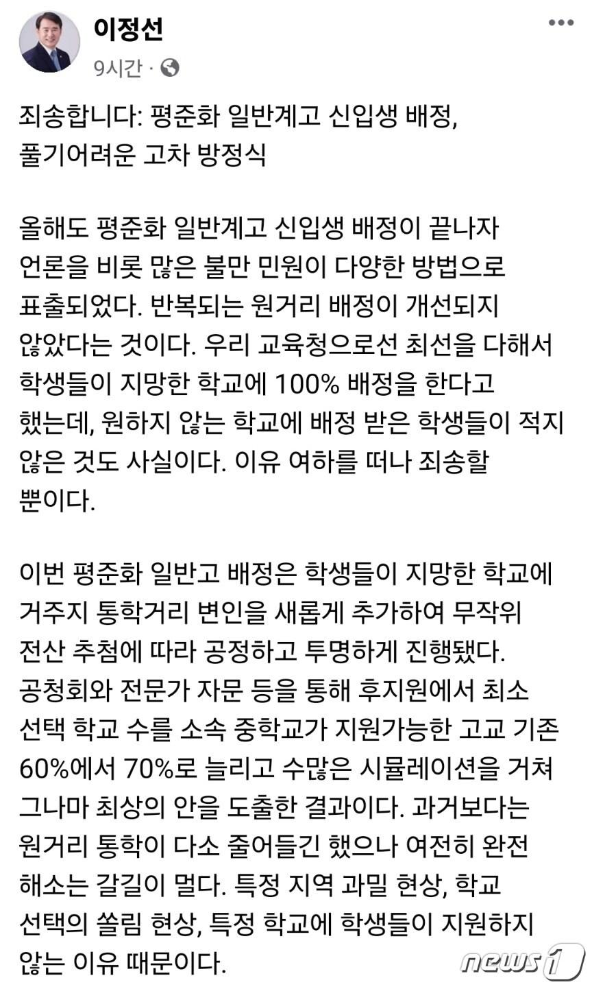 광산구 학생 1152명은 타구 학교로 배정…과밀·쏠림 현상교육감의 토로에 평소 교육청 비판 시민단체도 "자책할 일 아냐"페이스북에서 광주 일반계고 신입생 배정 고충을 토로하는 이정선 광주시교육감./뉴스1관련 키워드광주시교육청이정선서충섭 기자 주말 광주·전남 지방선거 출마자들 대거 출판기념회이정선 광주교육감 17일 조선대서 출판기념회관련 기사"광주전남특별시, 부교육감 3명·통합특별교육교부금 정부 지원도"[오늘의 주요일정] 광주·전남 (15일, 목)'광주전남특별시' 이전 임용 공무원, 종전 관할구역서 근무광주시교육청, 행정통합 특별법 발의 앞두고 의견 청취대전·충남서 좌초된 통합교육감…광주·전남서 첫 성사되나