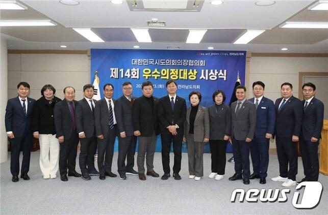 대한민국시도의회의장협의회 선정…지방자치발전에 기여우수의정대상을 수상한 전남도의원들이 상패 전수식을 갖고 기념사진을 찍고 있다.(전남도의회 제공)/뉴스1 관련 키워드전남도의회조영석 기자 진도 강강술래 예능보유자 박용순 씨, 전남도 문화상 수상전교조 전남지부 "광주·전남 통합 '교육 패러다임 전환' 기회돼야"관련 기사광주·전남 행정통합 특별법에 '실질적 지방주권 권한' 담긴다(종합)광주·전남 행정통합 특별법에 담길 내용은…"실질적 지방주권시대"속도 붙는 광주·전남 행정통합…광주시민들 "의견 청취 우선"화순·강진 군수선거 '인물 대 정당' 구도로 확장되나진보당 김선동 전남지사후보 "행정통합, 전북 포함한 호남대통합"