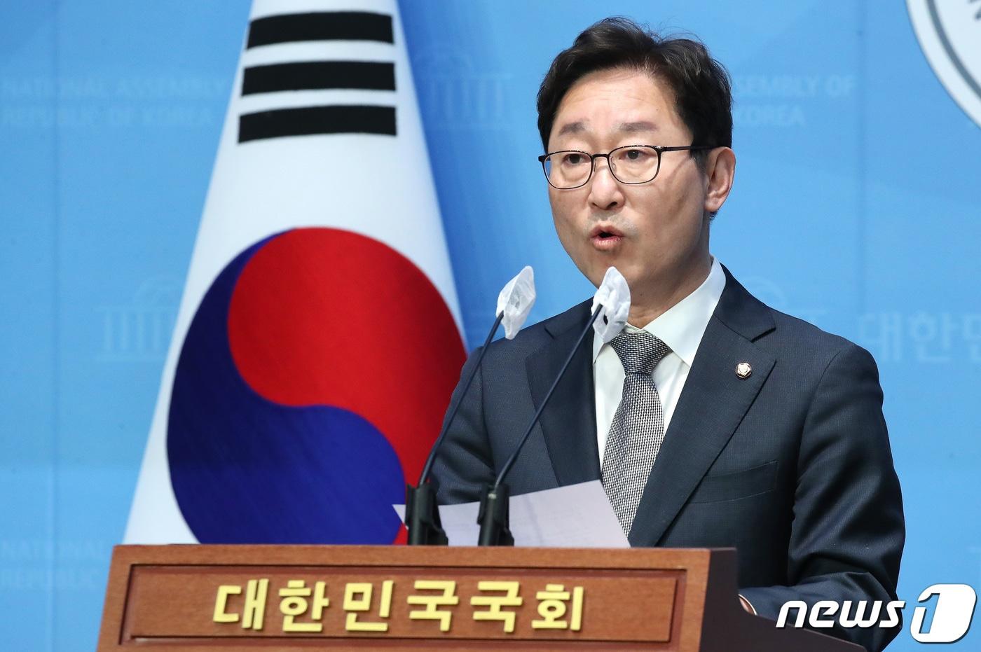 박범계 더불어민주당 중앙당 선거관리위원장이 지난달 27일 오후 서울 여의도 국회 소통관에서 경선 예비후보 제재조치 관련 브리핑을 하고 있다. 2024.2.27/뉴스1 ⓒ News1 임세영 기자