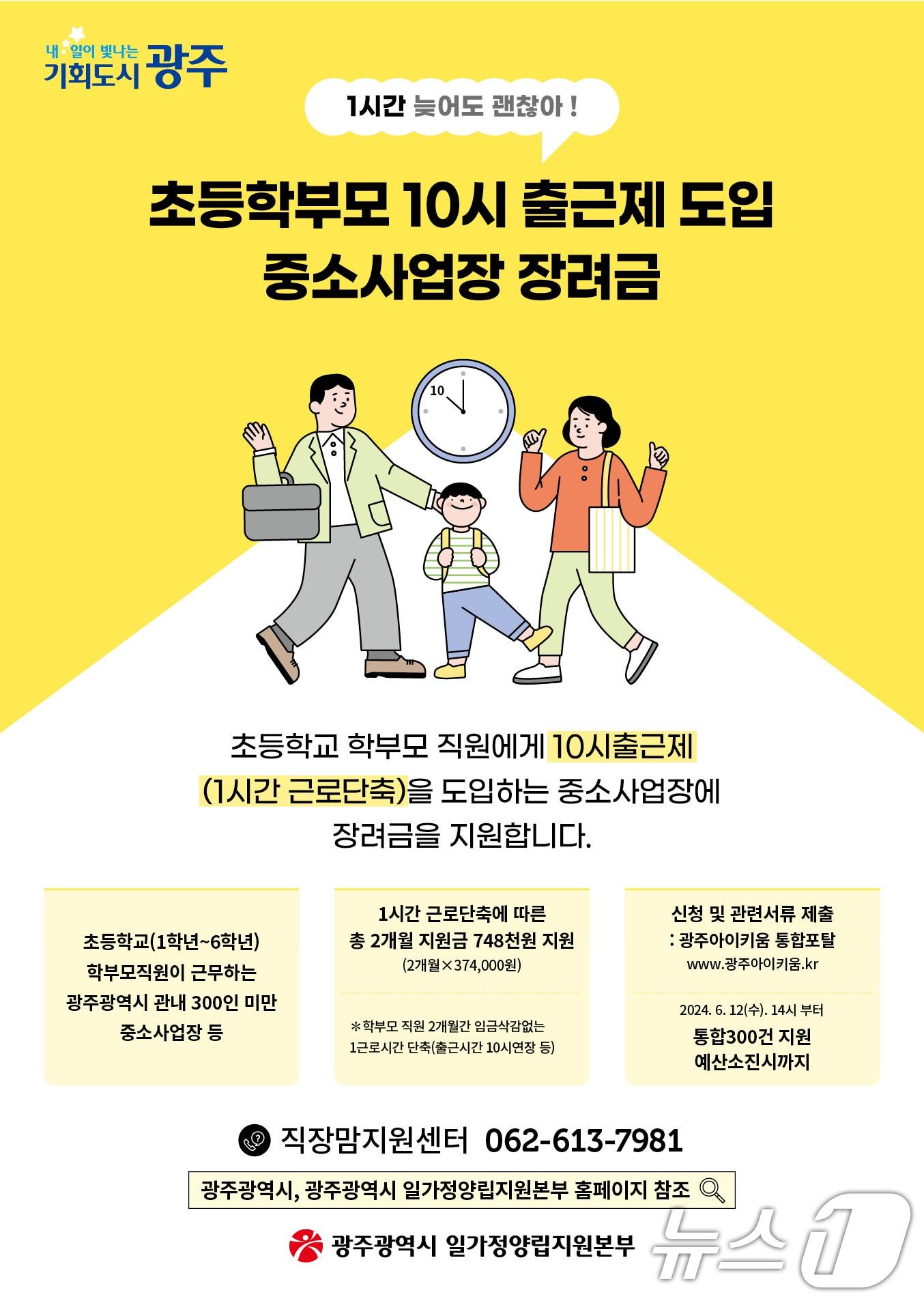 전국 최초 300인 미만 중소사업장에 2개월간 '지각장려금'초등학부모 10시 출근제 도입 중소사업장 장력금 포스터.(광주시 제공)/뉴스1 관련 키워드광주시초등학부모 10시출근제관련 기사광주교육청, 교육발전특구·교육통합지원체계 성과보고회"광주시 출생 지원책 성과"…출생증가율 2개월 연속 특광역시 1위'AI 당지기' 도입한 광주시, 정부 '국가공무원 당직제 폐지' 환영광주시, 지방시대 엑스포서 'AI 미래비전' 제시광주시-시민참여단 '광주온'…시정 공감대 넓혔다