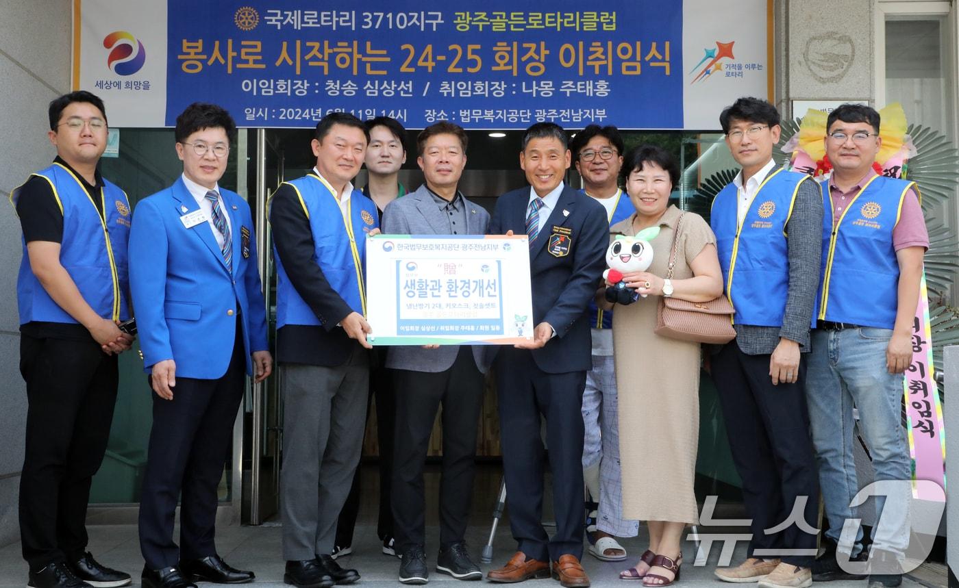 법무복지공단 광주전남지부에 환경 개선 용품 지원11일 오후 법무복지공단 광주전남지부에서 열린 국제로타리 3710지구 광주골든로타리클럽 회장 이취임식에서 주태홍 취임회장(왼쪽 여섯번째)과 심상선 이임회장(왼쪽 두번째) 등 회원들이 생활관 환경개선 용품을 전달한 뒤 기념촬영하고 있다. 2024.6.11/뉴스1 ⓒ News1 이수민 기자이수민 기자 광주시 금융정책협력관에 이수인 금감원 국장'미술관박람회 성공' 박영재 광주시 학예연구사, 문체부장관 표창