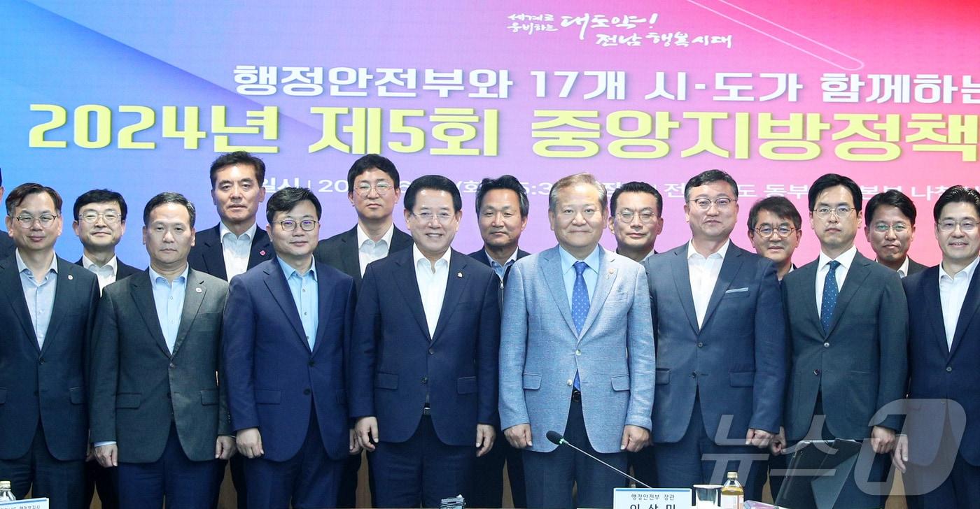 김영록 전라남도지사가 11일 도청 동부지역본부에서 열린 ‘2024년 제5회 중앙-지방정책협의회’에 참석, 참석자들과 기념촬영을 하고 있다.(전남도 제공) 2024.6.11/뉴스1 ⓒ News1