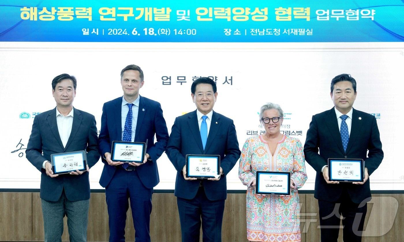 최적화 기술개발·교육체계 구축김영록 전라남도지사가 18일 전남도청 서재필실에서 노르웨이 해상풍력 발전사 딥윈드오프쇼어, 서부노르웨이응용과학대학, 목포대학교, 목포해양대학교와 ‘해상풍력 연구개발 및 인력양성 협력’ 업무협약을 체결하고 있다.(전남도 제공) 2024.6.18/뉴스1관련 키워드해상풍력노르웨이딥윈드오프쇼어목포대목포해양대서부노르웨이응용과학대학전원 기자 전남도, 장성·강진에 AI 데이터센터 구축전남도-시군, 지역 대도약 위해 행정통합 추진 연대관련 기사노르웨이 해상풍력 기업 여수섬박람회 5000만원 후원…협약 체결