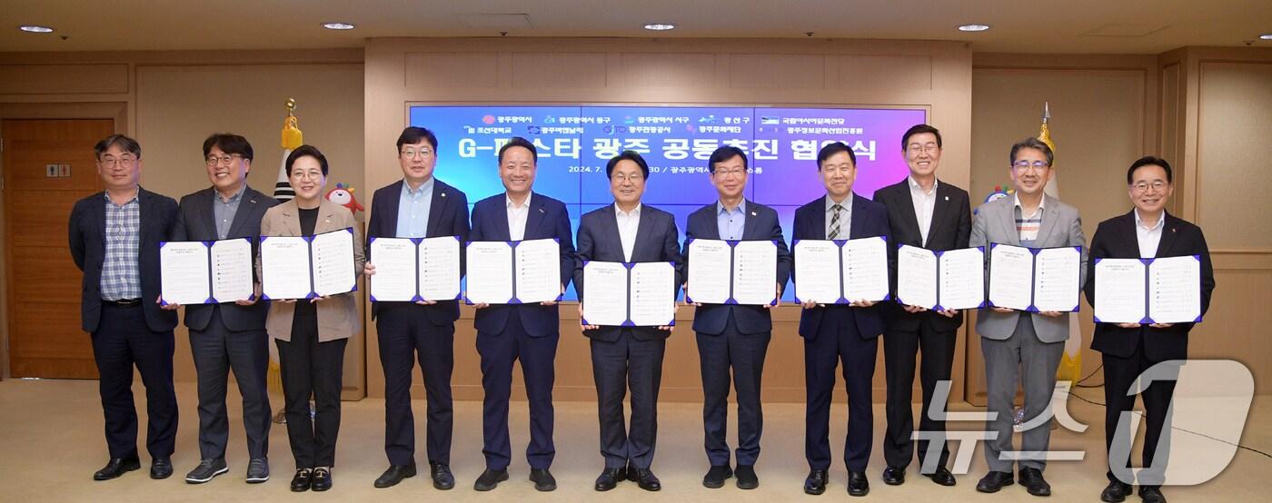 강기정 광주광역시장이 10일 오후 시청 비즈니스룸에서 열린 가을 이벤트 통합브랜드 'G-페스타 광주' 공동추진 협약식에 참석해 협약서에 서명한 후 참석자들과 함께 기념촬영을 하고 있다.(광주광역시 제공)2024.7.10/뉴스1