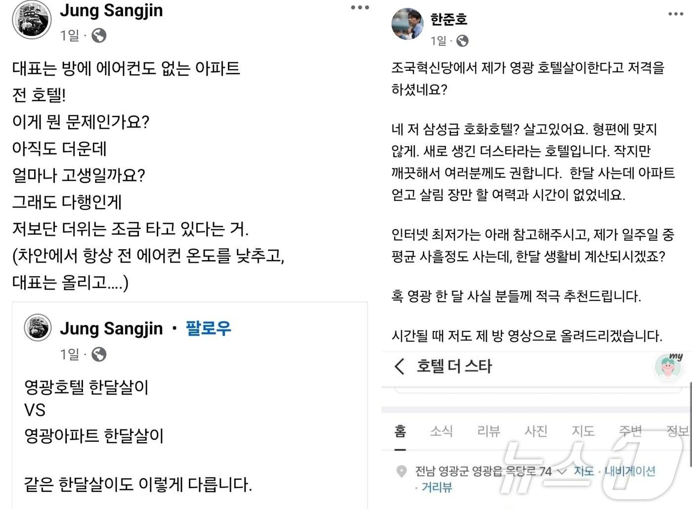한준호 "하루 6만원 3성호텔 사는데 조국당 지적"조국당 "완전한 오해…민주당, 큰 정당답게 품 보여야"10·16 전남 영광군수 재선거를 앞두고 정상진 조국혁신당 홍보위원장(왼쪽)이 ‘호텔vs아파트’라는 글을 올리자 한준호 민주당 최고위원이 “최저가 6만원의 3성급 호텔이다”고 맞받았다.(출처 페이스북)2024.9.28./뉴스1지난 24일 전남 영광 노인대학에서 더불어민주당 장세일 영광군수 후보 지원유세에 나선 정청래 의원이 인사차 찾아 온 조국 조국혁신당 대표를 반갑게 맞이하면서 포옹하고 있다. (유튜브 갈무리)2024.9.28./뉴스1관련 키워드민주당조국당영광서충섭 기자 민주당 중앙당 공관위원장에 김이수 조선대 이사장 선임"6개월 내 가능" 속도 붙는 광주·전남 행정통합…추진협의체 회의관련 기사'연임 없는 여수시장' 30년 징크스 깰수 있을까?이재명 대표·김정숙 여사 지지호소했지만…'조국당' 선택 이유는