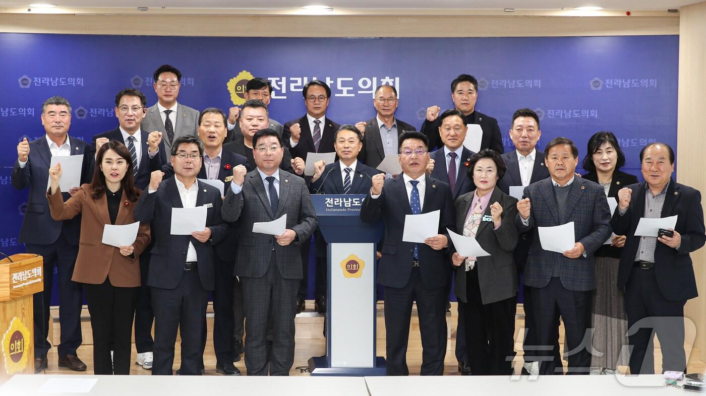 전남도의회 의원들이 목포대와 순천대의 대학통합 합의와 통합의과대학 설립 추진에 대해 환영하는 성명문을 발표하고 있다.(전남도의회 제공)/뉴스1