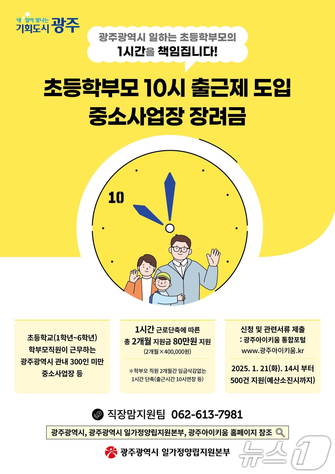 건수·지원금 확대…300인 미만 중소사업장 두달간 장려금 80만원광주시 초등학부모 10시 출근제 안내 포스터.(광주시 제공)/뉴스1 관련 키워드초등학부모 10시 출근제지각장려금관련 기사'저출생 극복 공로 인정'…광주시 국무총리 표창