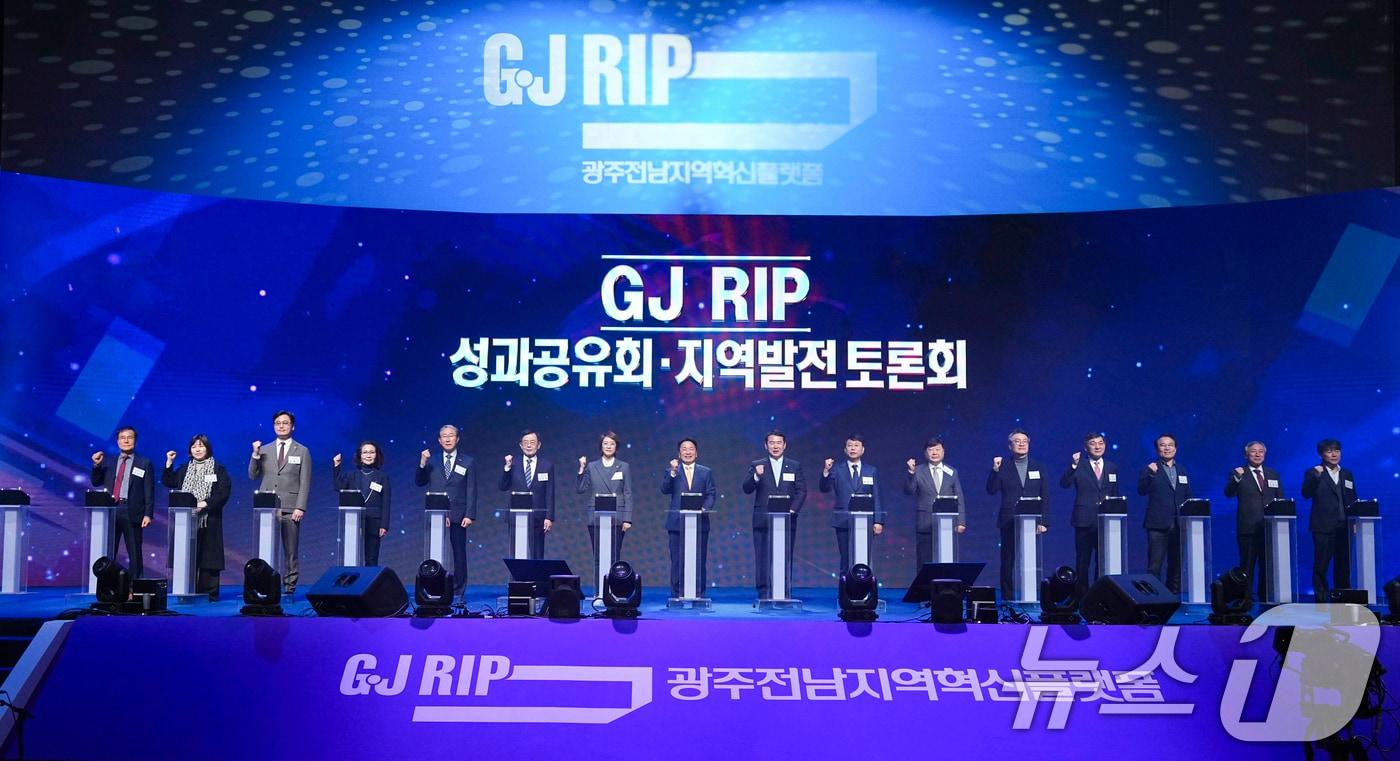 지역혁신사업 5년 성과공유…지역-대학 상생협력토대 구축향후 5년 주력산업 석박사 1000명 배출·창업 3만5000개 달성강기정 광주시장이 6일 서구 김대중컨벤션센터에서 열린 '지자체-대학 협력기반 지역혁신사업 성과공유회'에 참석해 세리머니를 하고 있다.(광주시 제공)2025.2.6/뉴스1 관련 키워드광주시리스라이즈