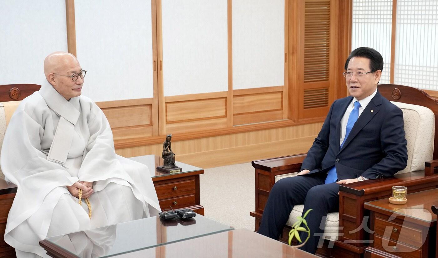 조계종 총무원장 진우스님 예방김영록 전남도지사가 11일 서울 대한불교조계종 총무원을 방문해 총무원장 진우스님을 예방하고, 제주항공 여객기 참사와 관련해 피해자들을 위한 지원을 아끼지 않은 조계종에 감사 인사를 전하고 있다.(전남도 제공) 2025.2.11/뉴스1관련 키워드尹비상계엄선포무안여객기참사대한불교조계종진우스님김영록전원 기자 '연 5조 지원·재원 재분배' 정부 파격 인센티브에 광주·전남 통합 탄력전남도, 장성·강진에 AI 데이터센터 구축