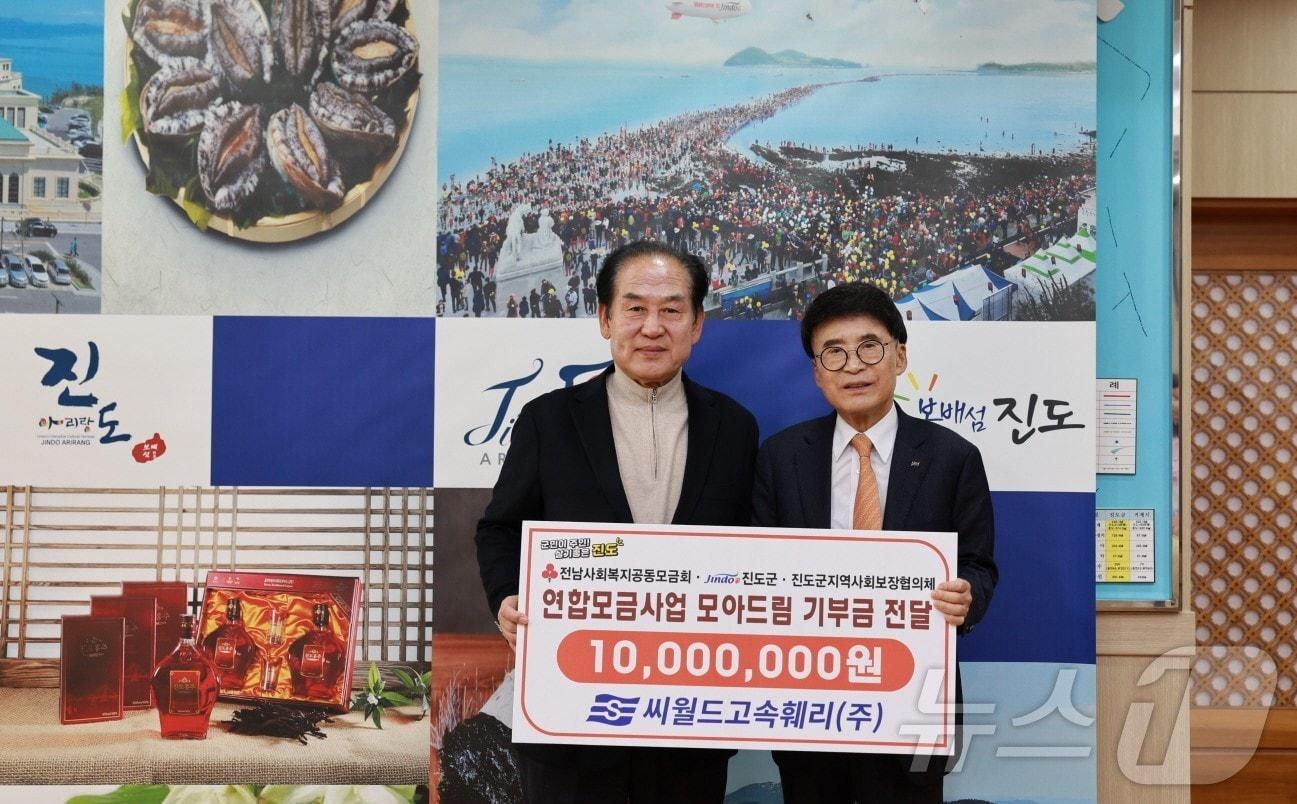 씨월드고속훼리㈜ 이종훈 대표(오른 쪽)가 '모아드림'에 1000만 원을 기탁 한 뒤 김희수 군수와 기념사진을 찍고 있다.(진도군 제공)/뉴스1관련 키워드진도군씨월드고속훼리조영석 기자 [화보] 사진으로 본 전남교육 이모저모광주·전남 교육통합도 급물살…시도교육감, 내주 첫 회동(종합)