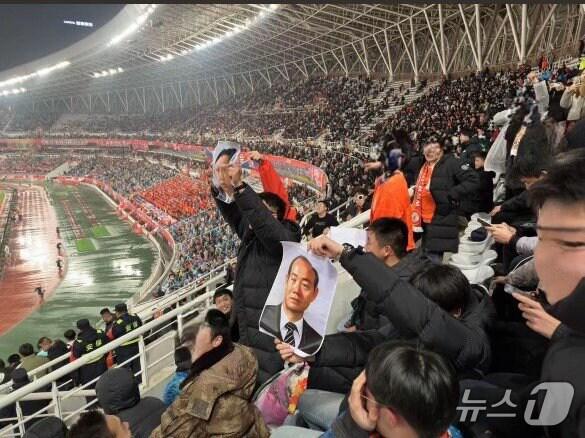 11일 중국 올림픽 스포츠센터에서 열린 24-25 ACLE 7차전 산둥 타이산과의 경기에서 산둥 팬들이 원정 서포터즈석을 향해 '전두환 사진'을 펼치며 도발하고 있다.(광주FC 제공. 재판매 및 DB 금지)/뉴스1 관련 키워드광주FC산둥 타이산전두환 사진관련 기사'울산전 노쇼' 中 산둥, 2년간 AFC 주관 대회 참가 금지"광주에 전두환이 돌아왔다"…이마 까진 중국인, 군화 신고 돌며 조롱'전두환 사진' 도발 산둥, ACLE 울산전 킥오프 2시간 남기고 기권"축구 경기에 전두환 사진이 왜"…K리그1 광주, 中 도발에 강력 대응