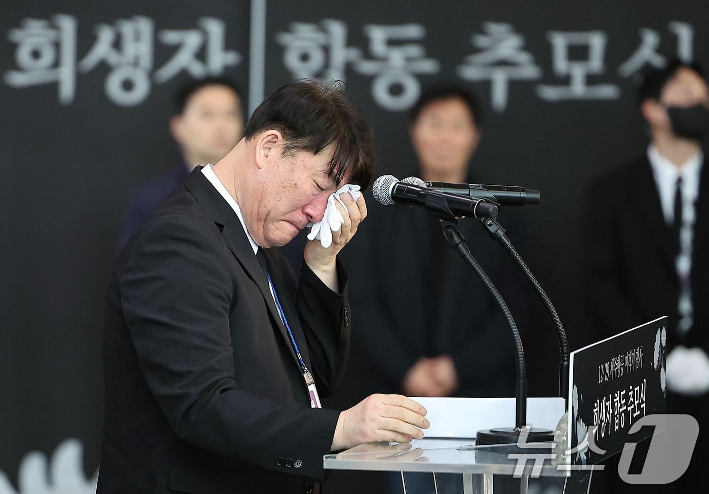49재 합동위령제…"국민 안전 위해 재발 방지책 마련해야"박한신 제주항공 참사 유가족협의회 대표가 지난달 18일 오전 전남 무안국제공항에서 열린 12·29 제주항공 여객기 참사 희생자 합동 추모식에서 추모사를 읽는 중 눈물을 훔치고 있다. 2025.1.18/뉴스1 ⓒ News1 김진환 기자관련 키워드무안여객기참사49재위령제유가족오열관련 기사제주항공 참사 49재 위령제…"사랑하는 이들이여 편히 쉬소서"(종합)"내 딸, 언니들이 꽃 사왔어"…제주항공 참사 유가족들 오열·통곡오늘 '제주항공 참사' 49재 엄수…유족들 일부 무안공항 지킨다제주항공 참사 희생자 '49재 합동위령제' 15일 무안공항서