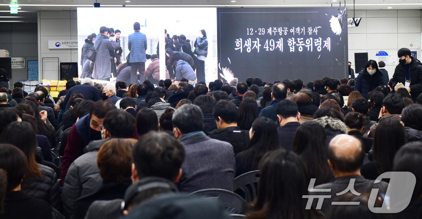희생자 유가족 등 700여명 참석…곳곳서 통곡·오열15일 오전 전남 무안국제공항에서 12·29 제주항공 여객기 참사 49재 합동위령제가 열리고 있다. 2025.2.15/뉴스1 ⓒ News1 김태성 기자15일 오전 무안국제공항에서 열린 12·29 제주항공 여객기 참사 49재 합동위령제에서 국회특위위원들이 헌화·분향하고 있다. 2025.2.15/뉴스1 ⓒ News1 김태성 기자15일 오전 무안국제공항에서 열린 12·29 제주항공 여객기 참사 49재 합동위령제에서 강기정 광주시장과 김영록 전남지사 등 기관단체장들이 분향하고 있다. 2025.2.15/뉴스1 ⓒ News1 김태성 기자관련 키워드무안여객기참사49재위령제관련 기사"내 딸, 언니들이 꽃 사왔어"…제주항공 참사 유가족들 오열·통곡제주항공 참사 유족 "그날의 아픔, 결코 잊지 말아야"오늘 '제주항공 참사' 49재 엄수…유족들 일부 무안공항 지킨다제주항공 참사 희생자 '49재 합동위령제' 15일 무안공항서