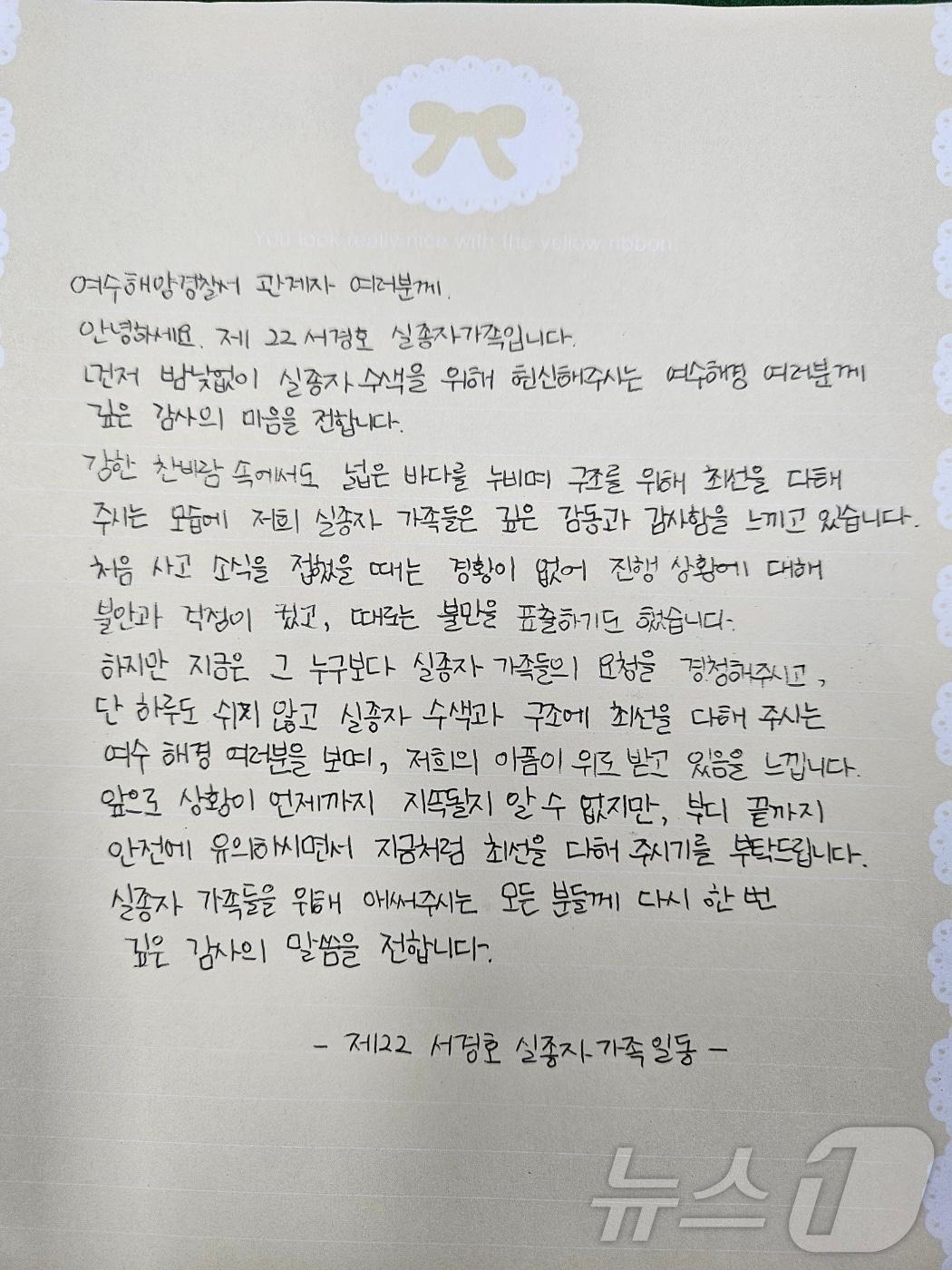 여수시·여수해경 등 수색당국에 감사 편지서경호 실종자 가족들이 여수해경에 보낸 감사 편지.(여수해경 제공. 재판매 및 DB 금지)2025.2.18/뉴스112일 전남 여수시 봉산동 소재 제22서경호 실종자 가족 대기실로 가족 및 현장 관계자들이 들어서고 있다.2025.2.12/뉴스1 ⓒ News1 김동수 기자관련 키워드여수서경호실종자수색지원편지관련 기사3명은 끝내 못찾고…침몰 78일 만에 서경호 모든 수색 종료서경호 내부 수색 27일 사실상 종료…실종자 3명은 어디에'한국인 선원 추정' 서경호 실종자 1명 추가 발견…3명은 어디에?'침몰 67일' 여수 서경호 실종자 1명 발견…4명은 어디에(종합)여수 서경호 침몰 67일 만에 실종자 1명 발견…신원 미확인