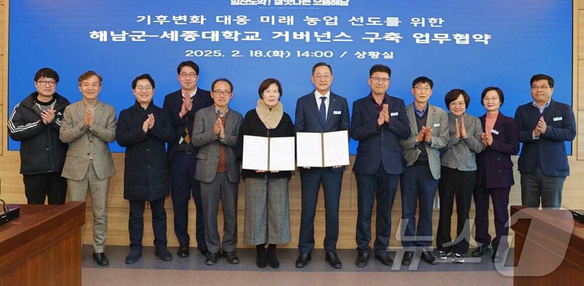 기후변화대응 작목 개발과 농특산물 기능성 물질 연구 협업해남군은 18일 세종대학교와 '기후변화 대응 미래농업 선도를 위한 거버넌스 구축' 업무협약을 체결했다. (해남군 제공, 재판매 및 DB금지) /뉴스1 관련 키워드해남군김태성 기자 국립남도국악원, 씻김굿 재해석 음반 '나를 위한 노래 씻김' 발매김산 무안군수 "광주 군 공항 인센티브로 반도체 클러스터 유치"관련 기사해남군, 동계 전지훈련 연인원 4만명 유치…경제효과 41억 기대전남테크노파크, '시군구 연고산업 육성사업 공모' 최종 선정해남 자원순환복합센터 연간 2만명 방문…"자원순환 랜드마크"해남군 " 25년 만에 인구 늘었다…AI·에너지 투자유치 영향"해남군 '친환경농업평가' 2년 연속 대상…전국 최대 4940㏊ 인증