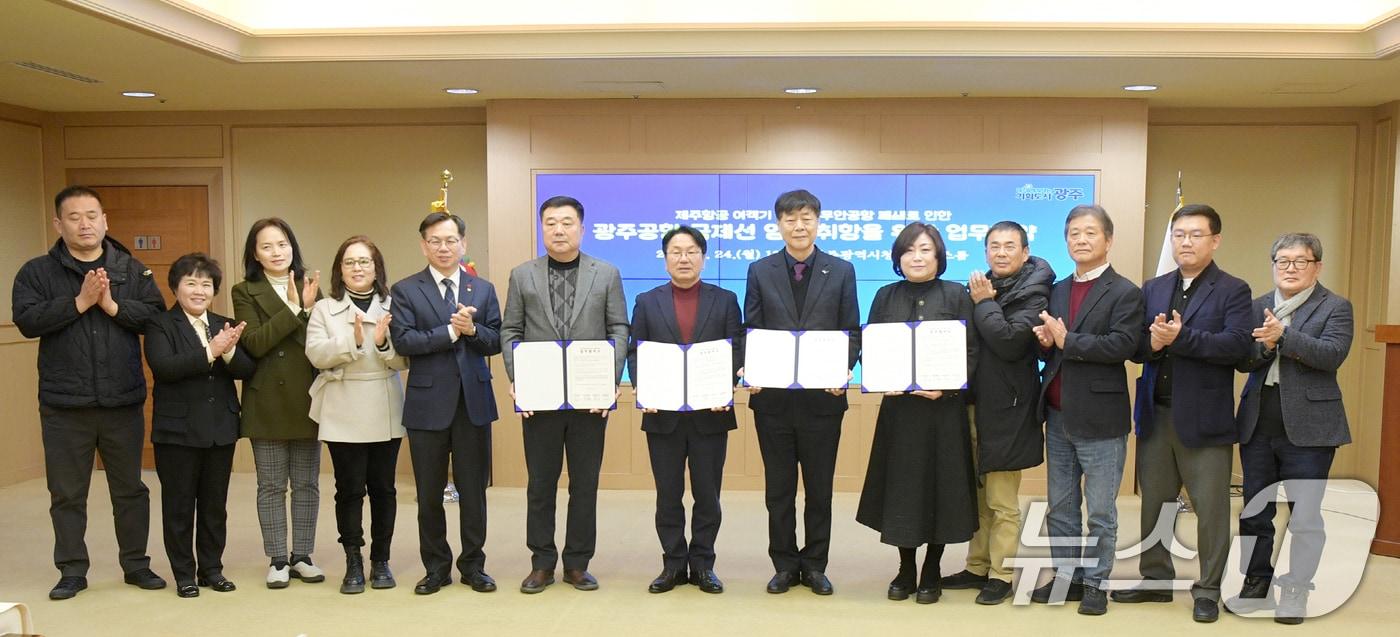 전세기·취항노선 발굴 통해 관광객 유치 등 협업체계 구축강기정 광주시장이 24일 오후 시청 비즈니스룸에서 광주관광협회장, 전세기 공급업체, 여행사 대표 등과 광주공항 국제선 임시 취항을 위한 상호 협력 업무협약을 체결한 후 기념촬영을 하고 있다.(광주시 제공. 재판매 및 DB 금지)2025.2.24/뉴스1 관련 키워드광주시광주공항국제선 임시취항관련 기사"군공항 이전 TF서 광주시 조건 없는 합의 우려""호남 하늘길 단절…광주공항 국제선 임시취항 등 현실적 대안 필요"박수기 시의원 "광주공항 국제선 재추진, 행정신뢰 흔들 우려"시민단체 "광주공항 국제선 임시취항 재신청 환영"내년 3월까지 무안공항 운항 불가…광주시 "호남 하늘길 단절 심각"