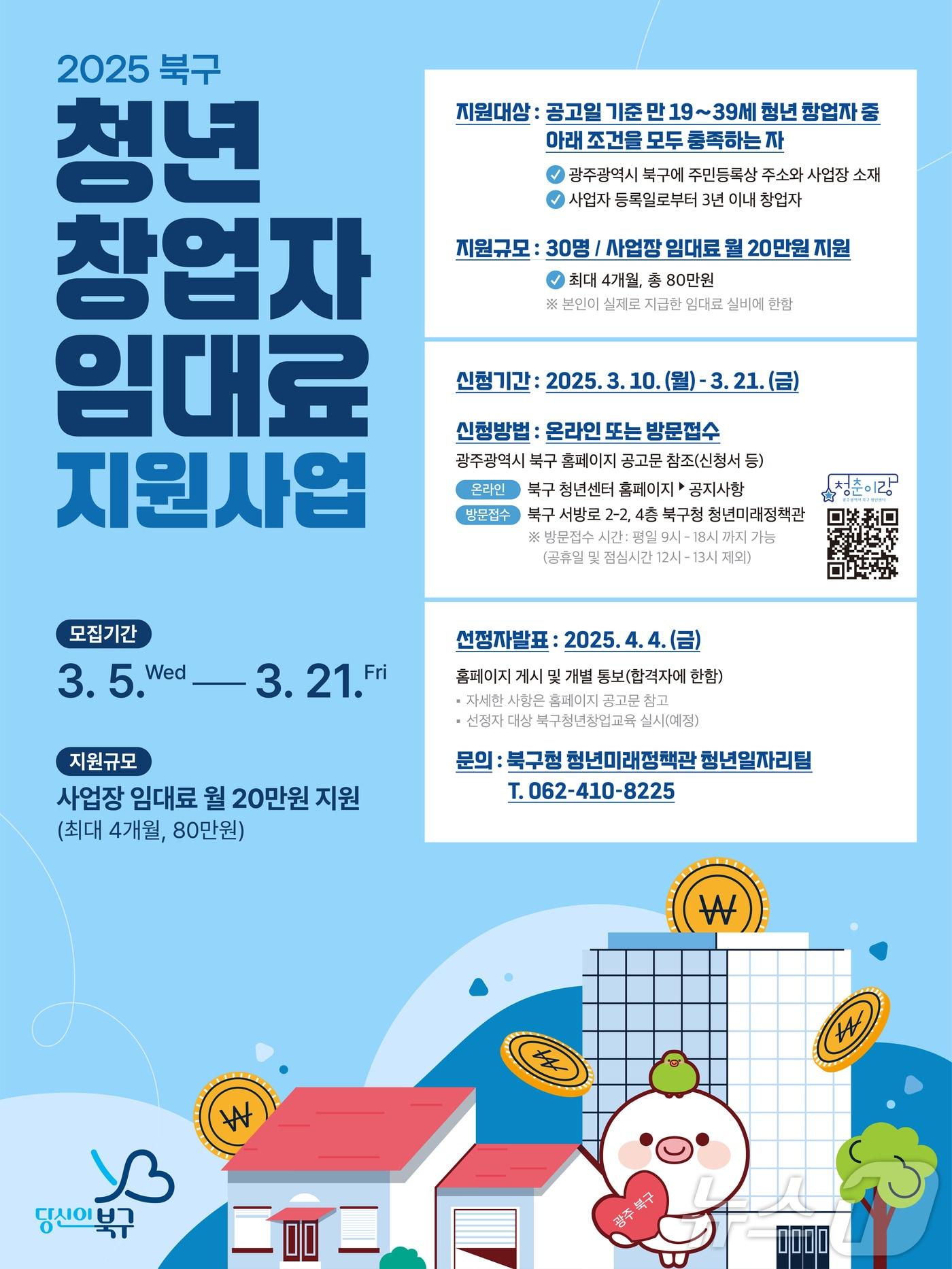 21일까지 참여자 모집…최종 30명 선발광주 북구 청년 창업자 임대료 지원사업(광주 북구 제공. 재판매 및 DB 금지)관련 키워드청년지원사업임대료지원광주 북구박지현 기자 광주전남 시민단체 "전봉준 등 2차 동학농민혁명 참여자 서훈하라"광주 북구, LH와 긴급주거지원 협약…대피 주민에 매입임대 19호 제공관련 기사"10년간 이사 걱정 없다"…광주 북구, 취약계층 주택 조성