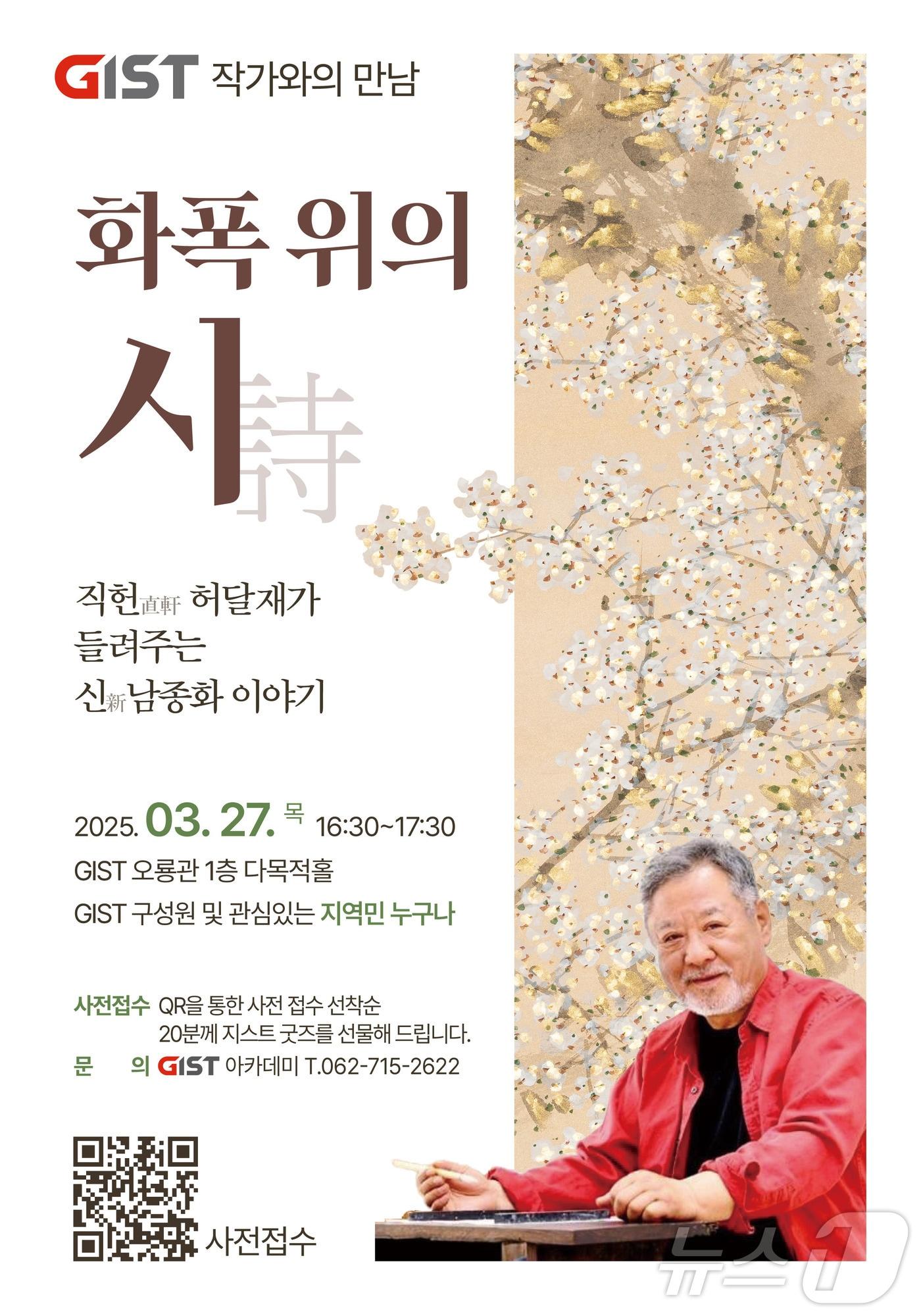 한국화의 매력 이해하고 작가와 직접 소통하는 특별한 시간'화폭 위의 시(時) - 허달재 작가와의 만남' 포스터(지스트 제공, 재판매 및 DB 금지) 관련 키워드지스트조영석 기자 GIST 교원 창업기업 ㈜오니온에이아이, CES 유망 AI 기술 선정진도 강강술래 예능보유자 박용순 씨, 전남도 문화상 수상관련 기사GIST 교원 창업기업 ㈜오니온에이아이, CES 유망 AI 기술 선정과기부 "4대 과기원, 각자 잘하는 연구에 집중해야 글로벌 성과"한미약품 '롤베돈' 당일 투여 근거 확보…美시장 '게임체인저' 부상GIST, 간암 치료 새 돌파구 제시…재발·치료 저항성 원인 밝혀[인사] 광주과학기술원(GIST)