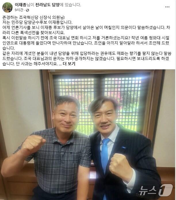 신장식 혁신당 의원 "민주당 후보, 담양에서 살아온날 며칠이나 되나"이재종 민주당 후보 "마타도어 대변말고 담양 위해 뭘 할지 대변해야"이재종 담양군수 후보 페이스북 캡처./뉴스1 2025.3.17/뉴스1 ⓒ News1 박준배 기자관련 키워드담양군수 재선거민주당조국혁신당신장식이재종관련 기사조국 "광주시장 염두에 둔 후보 있다…기초의회 집중공략"(종합)'혁신당 유일 단체장' 담양군수 수성 vs 민주당 탈환김영록 전남도지사 '3선' 성공할까? 민주당 국회의원들 도전 '거세'대통령 타운홀미팅 후 '눈물' 강기정 시장 "토론 자신 있었는데"'혁신당 1호 단체장' 정철원 군수 "조국 사면, 호남 정치 바꾼다"