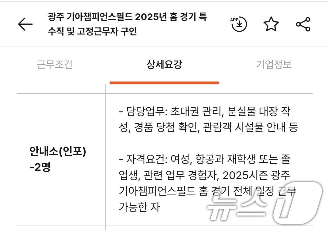 광주기아챔피언스필드 채용 공고 남녀고용평등법 위반뉴스1 보도 후 키·성별 제한 등 삭제 조치광주기아챔피언스필드 인포메이션 채용 공고. (온라인 사이트 캡처) /뉴스1DB 이수민 기자 광주시 금융정책협력관에 이수인 금감원 국장'미술관박람회 성공' 박영재 광주시 학예연구사, 문체부장관 표창