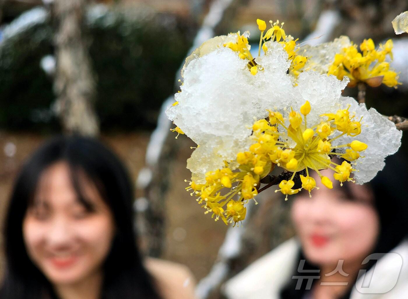 눈이 내린 18일 광주 북구청 광장 화단에 핀 산수유에 눈이 내려앉아 시민들에게 볼거리를 제공하고 있다.(광주 북구 제공. 재판매 및 DB 금지)
