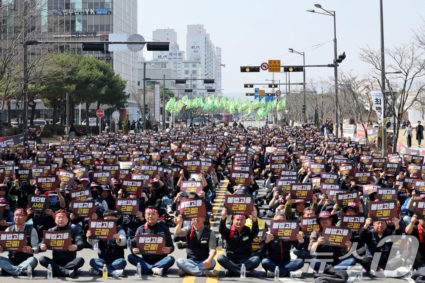 3000명, 광주시청 앞 출정식, 3㎞ 거리행진도광주 아파트 건설 현장 12곳 차질 가능성전국건설노동조합 광주전남건설지부가 21일 오후 광주광역시청 앞 도로에서 총파업 출정식을 열고 구호를 외치고 있다. .2025.3.21/뉴스1 ⓒ News1 박지현 기자관련 키워드건설노조 총파업파업단체협약건설노조박지현 기자 전직 장흥군의원, 벌목 작업 중 나무에 깔려 숨져함평 저온 저장창고 화재…60대 남성 화상관련 기사건설노조 대구서 총파업 출정식…"건설현장 4대악 근절해야"대구경북 건설노조 "중대재해·불법하도급·불법고용·체불 근절" 촉구"노란봉투법, 하청 '블랙리스트' 필연적…원청도, 하청도 다 망해"'임협 난항' 울산 노동계 하투 본격화…연쇄 파업 우려'파업권 확보' 울산플랜트건설노조, 5000여명 19일 상경 투쟁