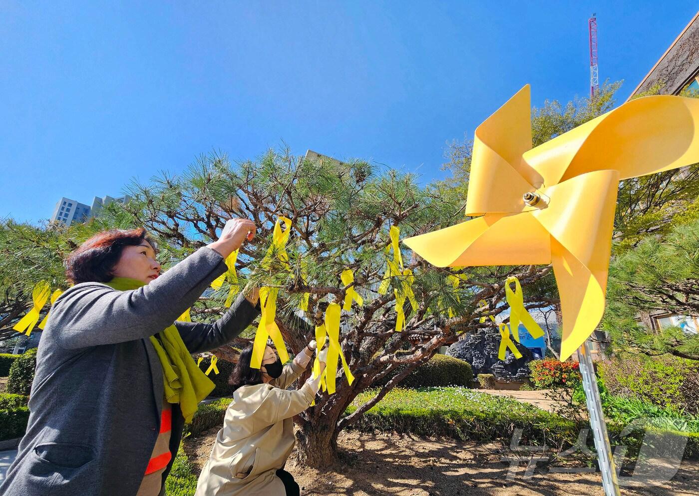 7일 광주 북구청 광장에서 구청 인권교육과 직원들이 세월호 참사 11주기를 맞아 광장 화단에 바람개비와 노란 리본 등을 설치하고 있다.(광주 북구 제공) 2025.4.7/뉴스1 ⓒ News1 박지현 기자