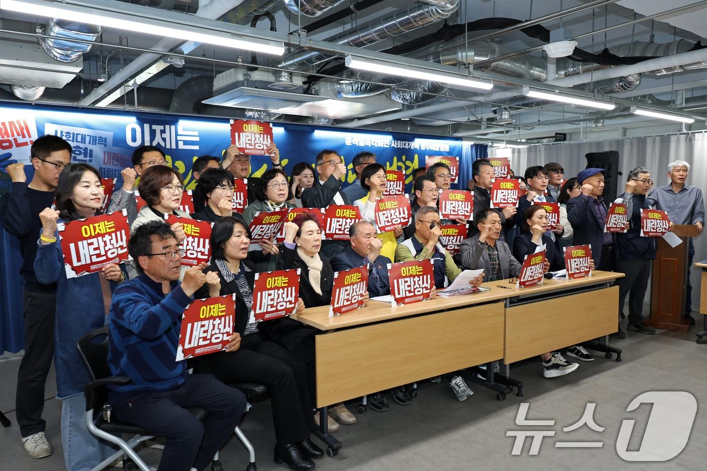 광주 186개 시민사회단체가 모인 윤석열 정권 즉각 퇴진·사회대개혁 광주비상행동이 8일 광주 전일빌딩245에서 기자회견을 열고 '나를 위한 대한민국'을 건설하기 위한 광주의 제안이 담긴 광주선언문을 발표하고 있다. 2025.4.8/뉴스1 ⓒ News1 이승현 기자