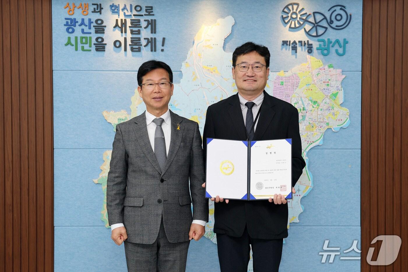 박병규 광주 광산구청장이 16일 감염병관리과 곽형준 의무사무관(오른쪽)을 역학조사관으로 임명한 뒤 기념사진을 찍고 있다. (광산구 제공. 재판매 및 DB 금지)