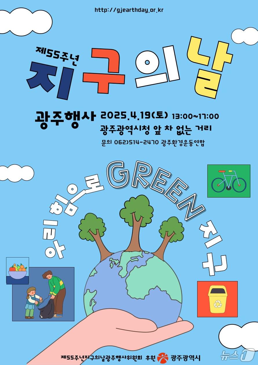 19일 지구의날 기념행사…시청 앞 '차없는 거리'22일 오후 8시부터 10분간 전국 소등제55주년 지구의 날 광주 행사 포스터.(광주시 제공. 재판매 및 DB 금지)관련 키워드광주시지구의 날관련 기사광주공원 주차장에 '청춘 빛포차 광장' 조성