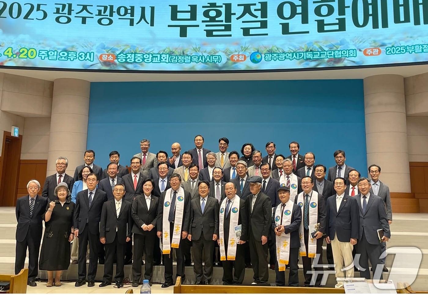 강기정 광주시장이 20일 오후 송정중앙교회에서 열린 2025년 부활절 연합예배에 참석해 축사를 한 후 참석자들과 함께 기념촬영을 하고 있다.(광주시 제공. 재판매 및 DB 금지) 2025.4.20/뉴스1