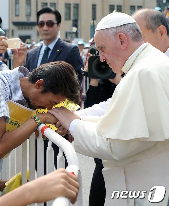 프란치스코 교황이 2014년 8월 16일 서울 광화문 광장에서 열린 '윤지충 바오로와 동료 순교자 123위 시복식' 카 퍼레이드 도중 오픈카에서 내려 '세월호 특별법' 제정을 요구하며 단식중인 '유민 아빠' 김영오(47)씨를 위로하고 있다. (교황방한위원회 제공) 2014.8.16/뉴스1이수민 기자 한낮 나주 공산면 주택 화재…인명피해 없어광주시 "1조 투자펀드로 창업 투자생태계 강화"