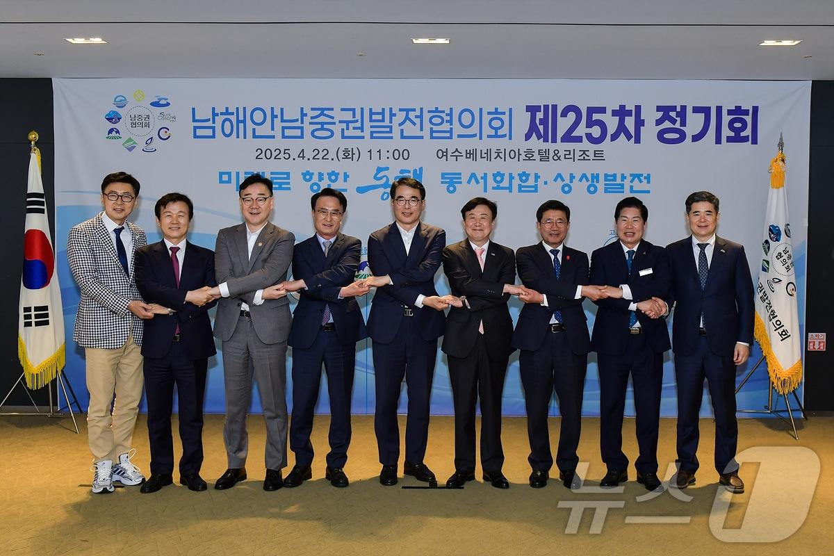 여수서 25차 정기회…9개 시군 단체장 참석남해안남중권발전협의회는 22일 전남 여수에서 제25차 정기회를 열고 기념사진을 찍고 있다.(여수시 제공. 재판매 및 DB 금지)관련 키워드남해안남중권정기회여수관련 기사남해안남중권발전협 '여수섬박람회' 입장권 약정…순천·광양 1억씩남해안남중권발전협의회, '사천우주항공 고속국도' 구축 한목소리
