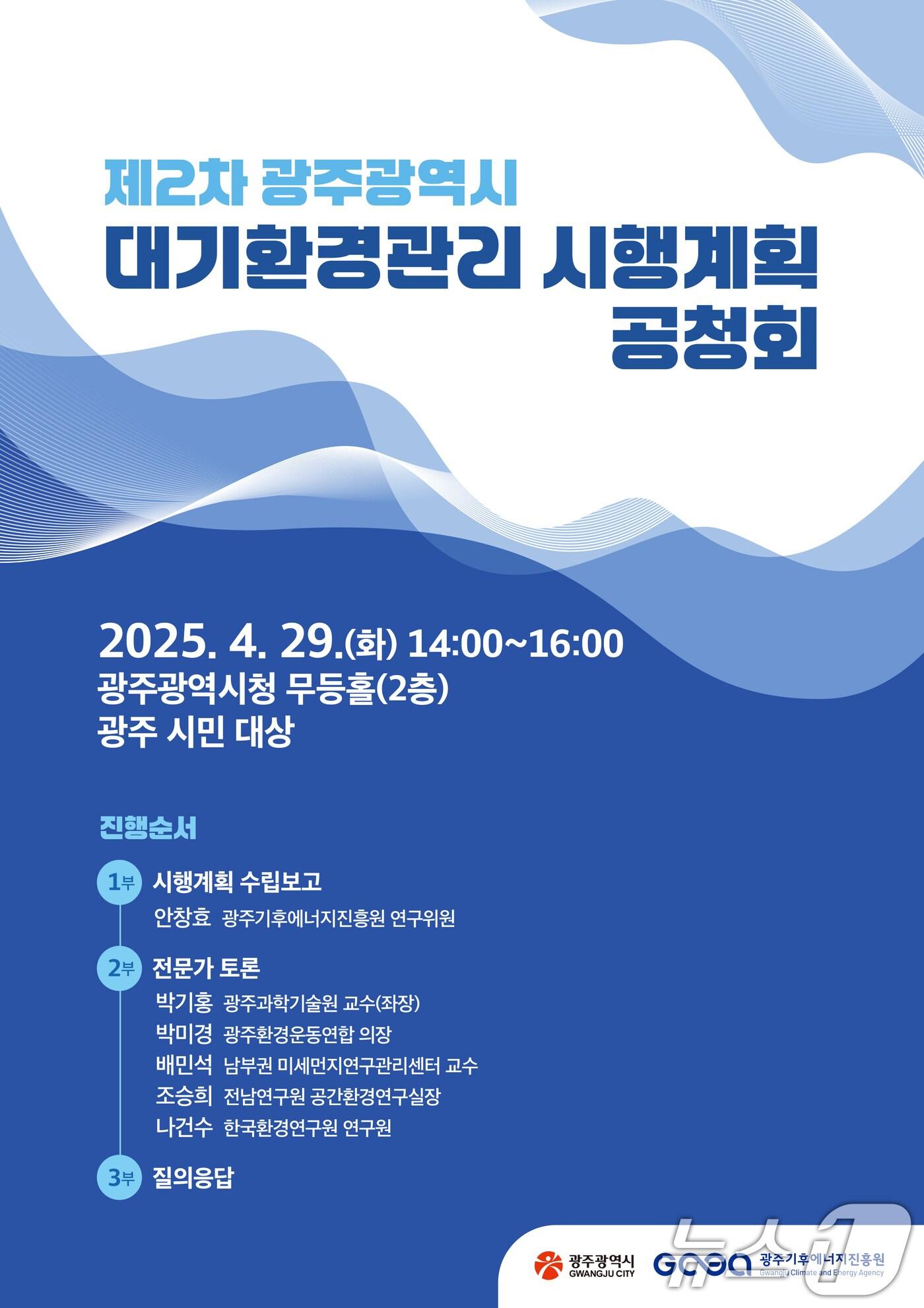 제2차 광주시 대기환경관리 시행계획 공청회 안내.(광주시 제공. 재판매 및 DB 금지) 관련 키워드광주시대기환경관리 시행계획관련 기사광주시, 19일 초미세먼지 재난 대응 훈련…합동 대응체계 점검광주시·영산강환경청 등 '미세먼지 계절관리제 캠페인'