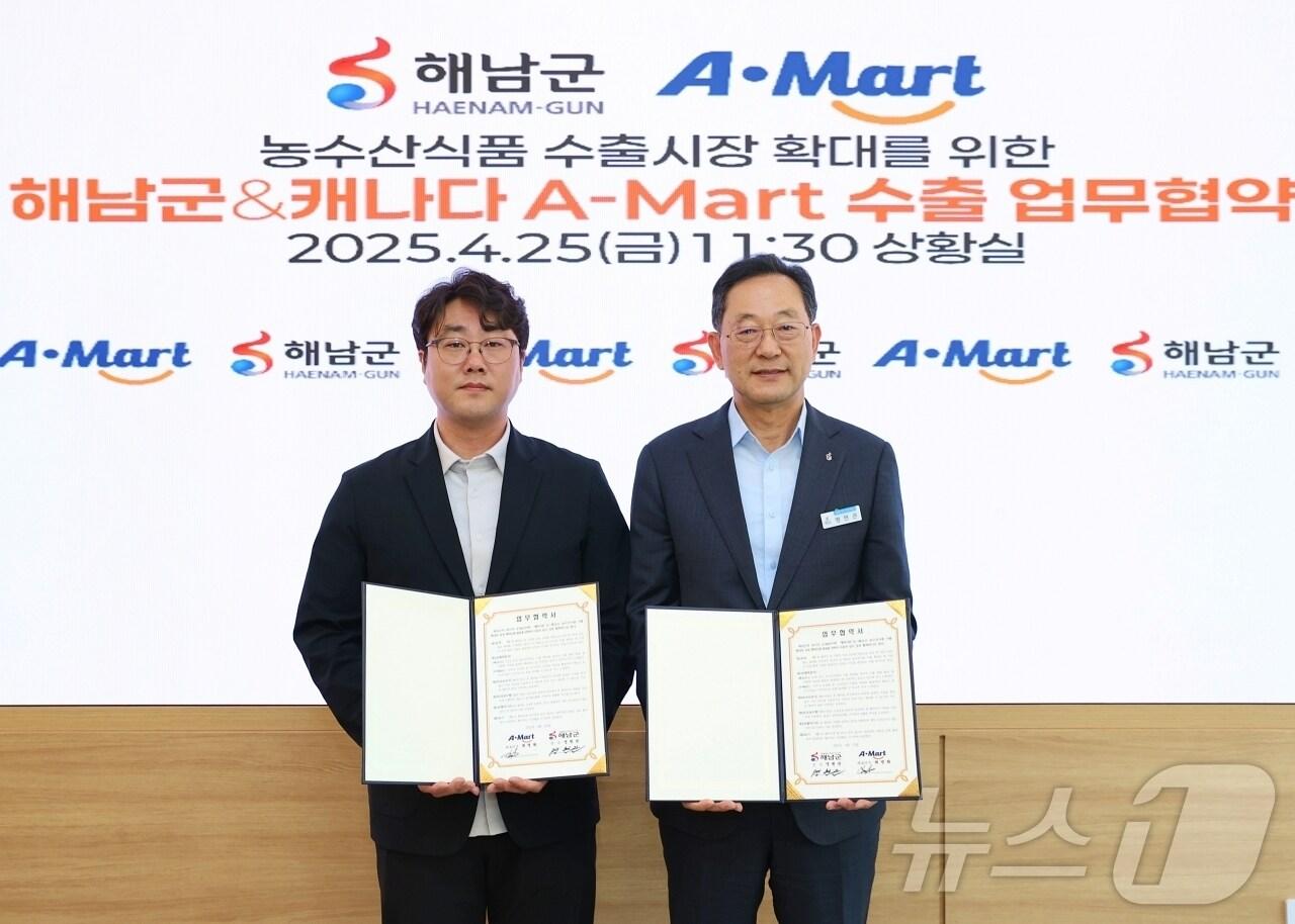 명현관 군수 "우수 농수산 수출제품 지속적으로 발굴"해남군 -캐나다 에이마트 농식품 수출 확대 업무협약 (해남군 제공. 재판매 및 DB금지) /뉴스1 관련 키워드해남군김태성 기자 해남군 고향사랑기부금 10억 돌파…3년 누적 25억 모금영암군, 청년부부에 최대 500만원 지원관련 기사화순·강진 군수선거 '인물 대 정당' 구도로 확장되나해남군 고향사랑기부금 10억 돌파…3년 누적 25억 모금[오늘의 주요일정] 정치·정부 (12일, 월)해남고구마, 중소농 공동출하로 서울 가락시장 첫 진출해남에 한전KDN '에너지 특화형 AI데이터센터' 들어선다