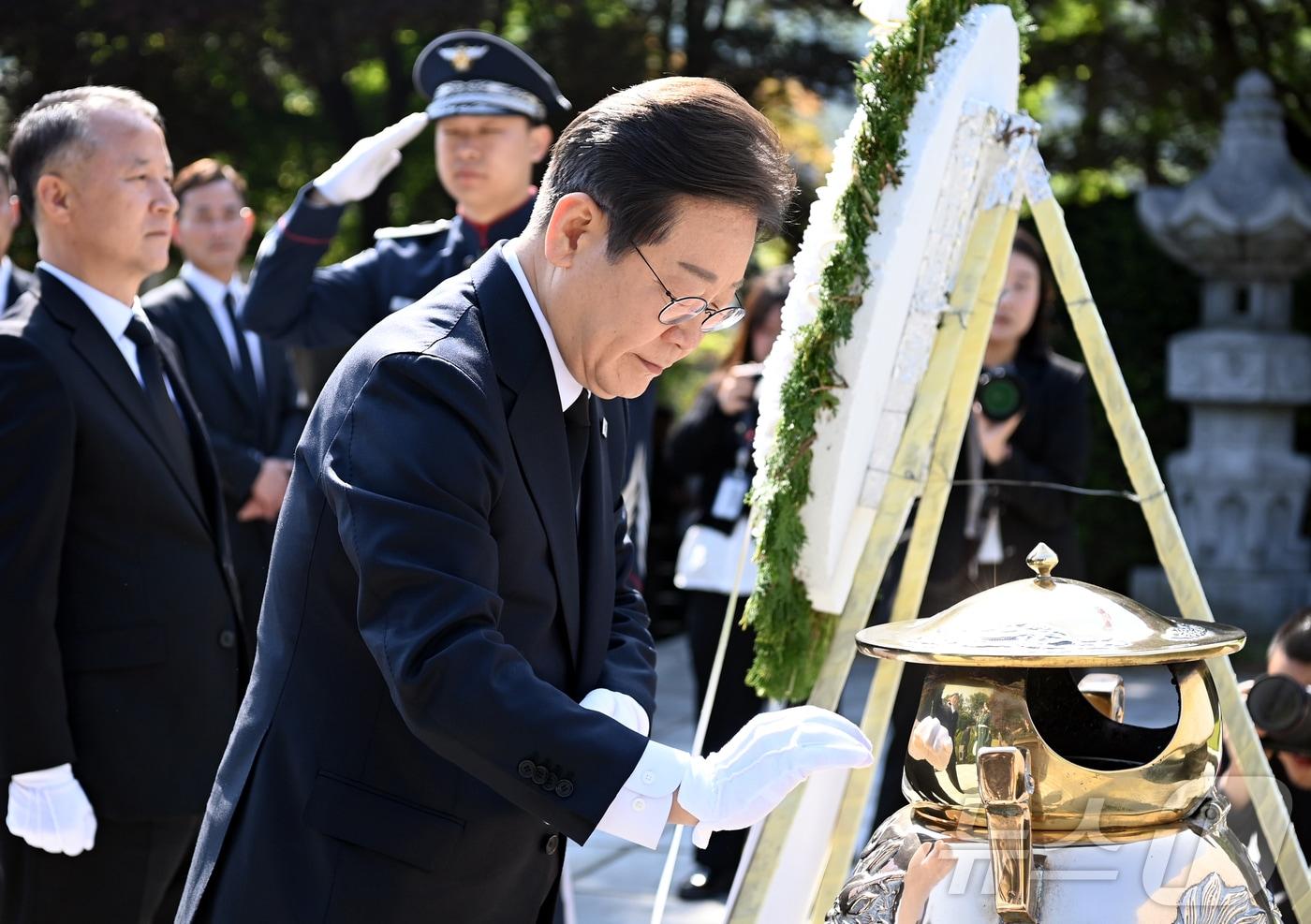 이재명 더불어민주당 대선 후보가 28일 오전 서울 동작구 국립서울현충원 고 이승만 전 대통령 묘역을 찾아 참배하고 있다.(공동취재) 2025.4.28/뉴스1 ⓒ News1 이재명 기자