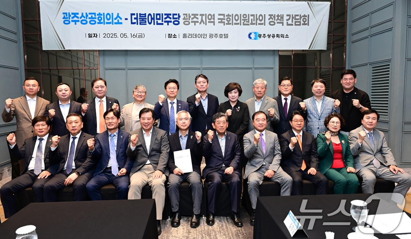 광주상공회의소와 더불어민주당 광주지역 국회의원이 16일 정책간담회를 연 후 기념촬영을 하고 있다.(민주당 광주선대위 제공. 재판매 및 DB 금지)2025.5.16/뉴스1
