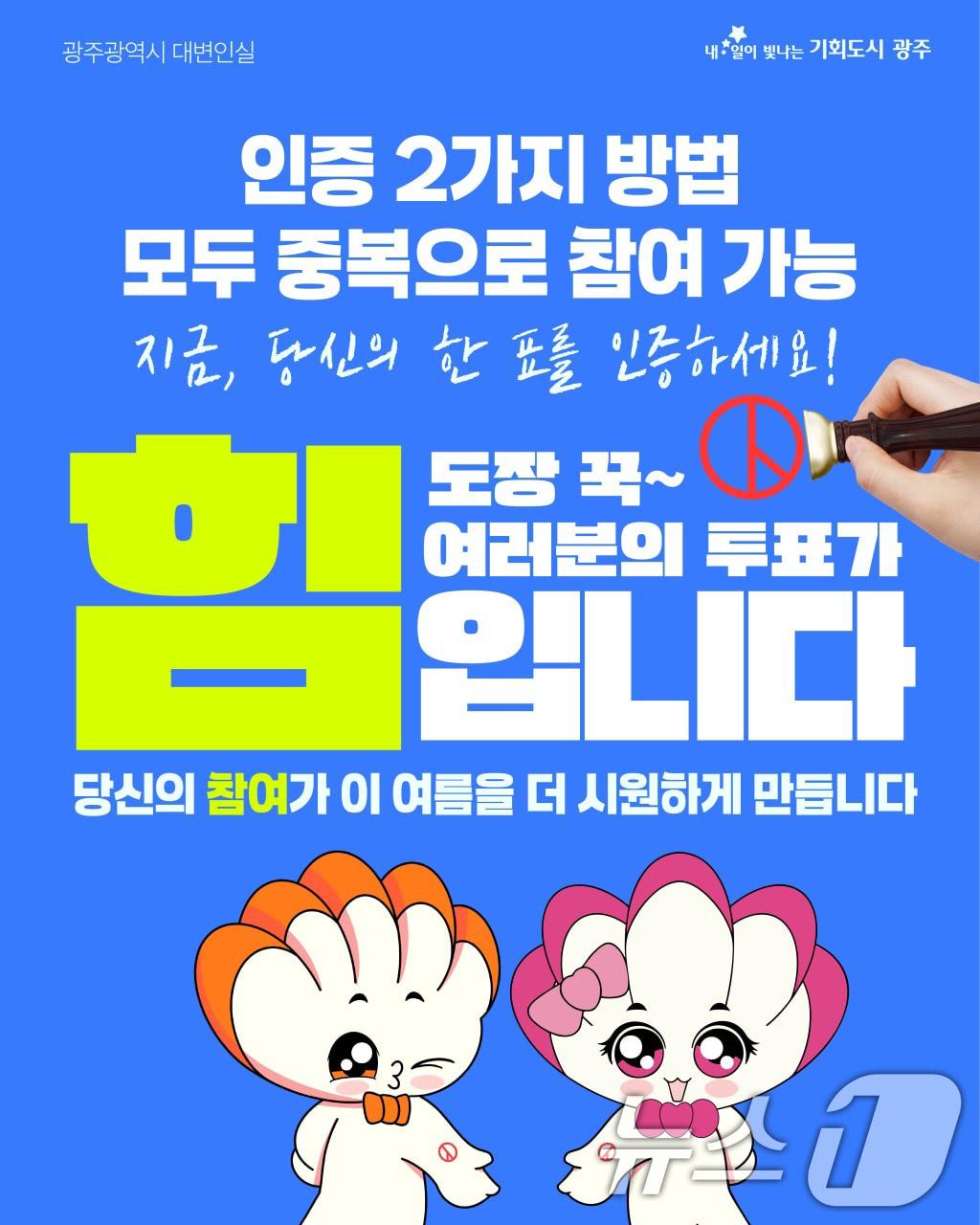 손등에 기표도장·투표소 앞 인증…'빛돌이 인증종이' 활용도광주시 투표 인증 이벤트 안내.(광주시 제공. 재판매 및 DB 금지)관련 키워드광주시투표 이벤트관련 기사광주시 '선 넘는 여행'…광주·전남 연계 관광 추진"가장 유쾌한 홍보 문구는?"…광주시 셀프홍보어워드광주시·교육청·5개 구청 "역대 최고 투표율 92.5% 달성"