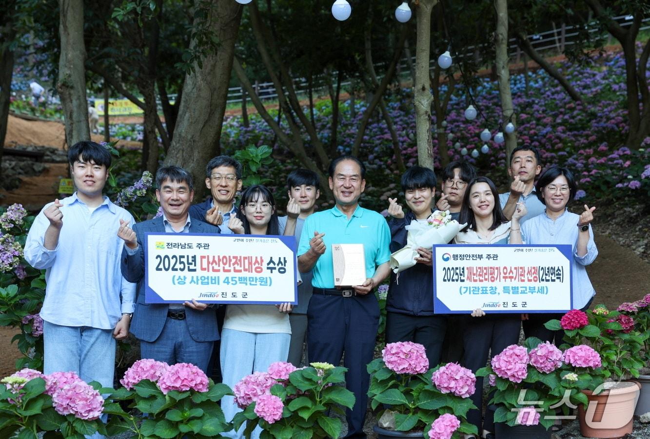 김희수 군수(가운데)를 비롯한 진도군 관계자들이 '다산안전대상'을 수상한 뒤 기념사진을 찍고 있다.(진도군 제공, 재판매 및 DB 금지)/뉴스1관련 키워드진도군조영석 기자 진도군, 민생회복 소비쿠폰 등 지역경제 3개 분야 '우수'서기웅 한국광기술원 제9대 원장 "글로벌 혁신기관 도약"관련 기사국토부 지역제안형 특화주택 공모에 전남 7개소 선정진도군, 민생회복 소비쿠폰 등 지역경제 3개 분야 '우수'전남도 "진도, 대한민국 대표 수산·문화 1번지 육성"[오늘의 주요일정] 광주·전남 (30일, 화)진도군, 지난해 청년 인구·사업체 각각 25% '동일'