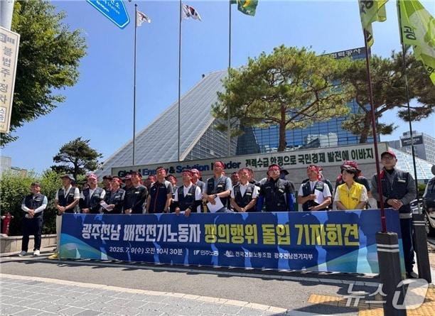 불법 하도급 구조 문제 지적…총파업 등 강경 투쟁 예고민주노총 건설노조 광주전남전기지부는 9일 오전 한국전력 광주전남본부 앞에서 기자회견을 열고 임금 삭감 철회를 요구하고 있다.(건설노조 제공. 재판매 및 DB금지)관련 키워드건설노조배전노동자배전 전기노동자불법하도급임금삭감박지현 기자 송성훈 제16대 광주 남부소방서장 취임…"현장 중심 소방"문인 광주 북구청장, 내년 1월8일 사임… 광주시장 출마