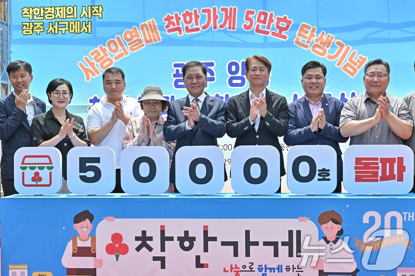 김이강 광주 서구청장이 10일 서구 양동전통시장 일원에서 열린 '양동 착한시장·착한거리 선포식'에서 참석자들과 함께 착한가게 5만호 돌파 기념 퍼포먼스를 펼치고 있다. (광주 서구 제공. 재판매 및 DB금지) 2025.7.10/뉴스1