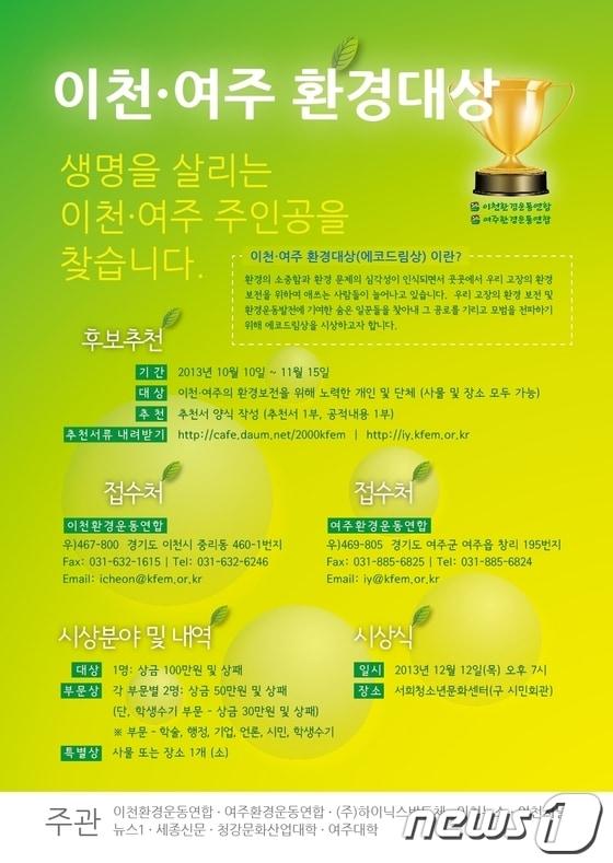 12013 이천.여주 환경대상 포스터© News1 관련 키워드이천여주환경대상에코드림환경연합여주대학SK하이닉스청강문화산업대학관련 기사임금님표이천쌀, '올해의 브랜드 대상' 6번째 수상SK하이닉스, 사회공헌 사업에도 AI 접목…사회 변화 이끈다파주·광명 '7월에 40도'…수도권 관측 이래 '사상 처음'(종합)CJ대한통운, '주 7일 배송' 권역 전국 134개 읍면으로 확대경기도교육청, 학습 소외 학생 위한 '수업위탁형 프로그램' 운영