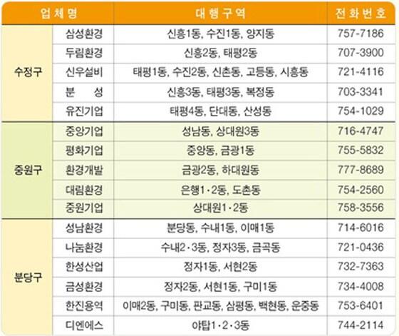 구역별 청소대행업체 지정…3월2일부터 시행성남시 대형폐기물 처리 청소대행업체 전화번호 표. ⓒ News1최대호 기자 쓰레기 직매립 금지 D-1…경기도 "공공+민간, 전량 소각"'통행료 반값'부터 결혼 축하포인트까지…경기도, 새해 7대 정책