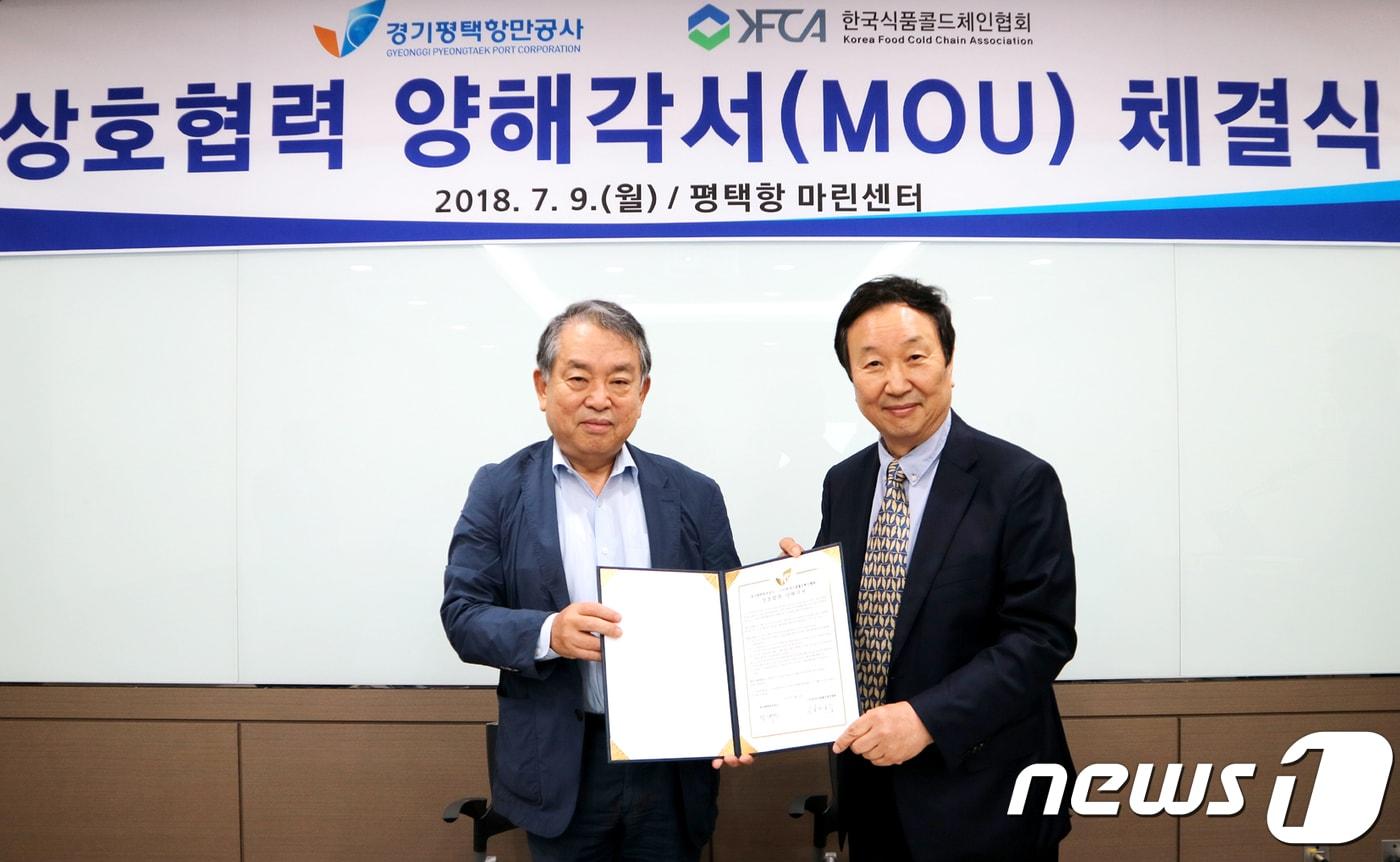 평택항 콜드체인 물류 활성화, 항로 확대 협력 등경기평택항만공사(사장 황태현)와 한국식품콜드체인협회(회장 정명수)는 9일 평택항 마린센터에서 평택항 콜드체인 물류 활성화 및 지역경제 발전 위한 상호 업무협약(MOU)을 체결했다.(평택항만공사 제공) ⓒ News1 진현권 기자
