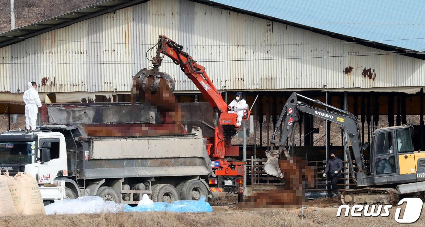 30일 오후 구제역 확진 판정을 받은 경기도 안성시 양성면의 한 한우농가 인근에서 방역 당국 관계자들이 예방적 살처분 작업을 하고 있다. 2019.1.31/뉴스1 ⓒ News1 조태형 기자