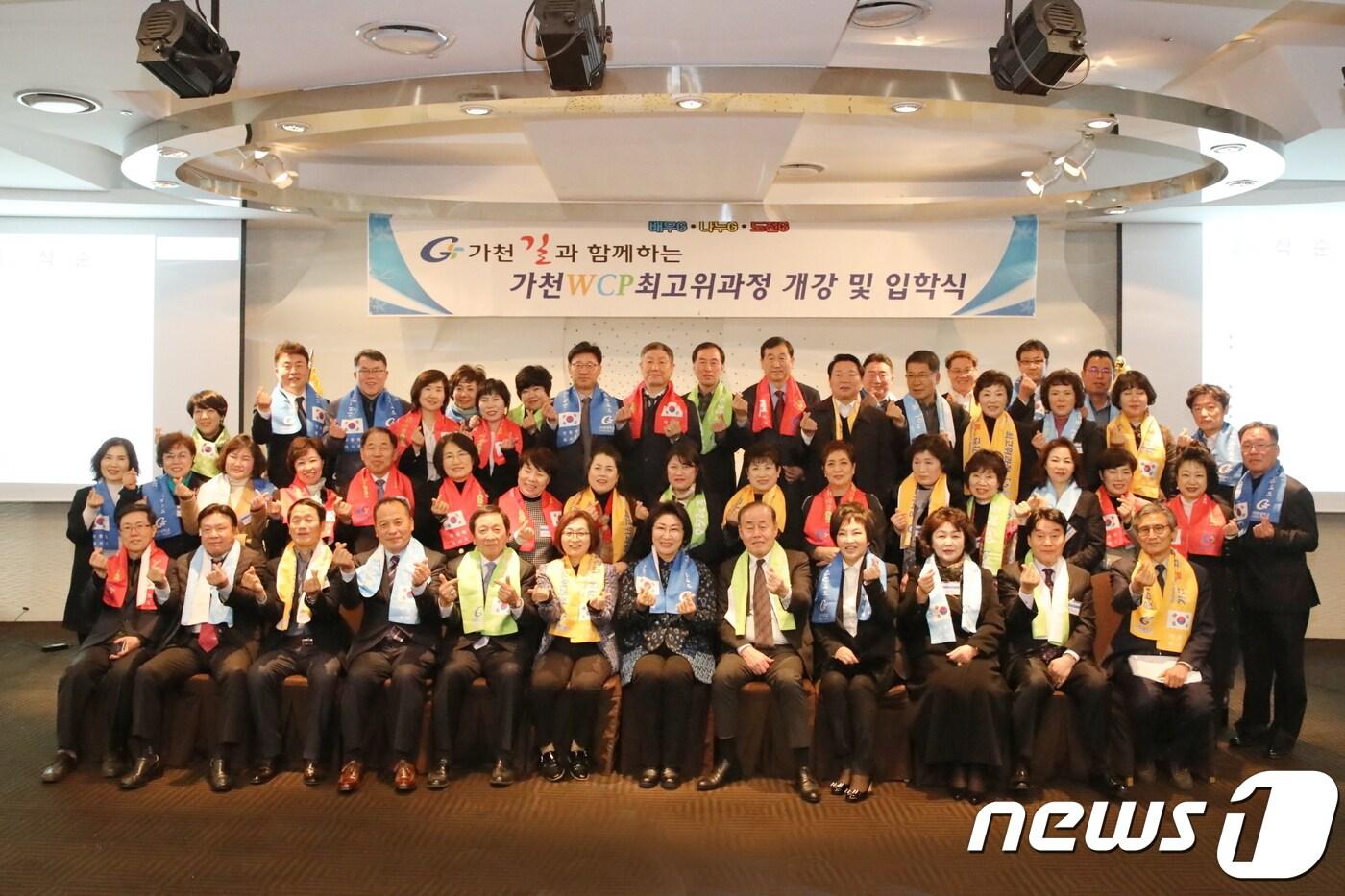 12일 가천대 컨벤션센터에서 열린 WCP최고위과정 3기 입학식에서 가천대 최미리 기획부총장과 은수미 성남시장이 원생들과 함께 기념사진을 촬영하고 있다.(가천대 제공)ⓒ 뉴스1