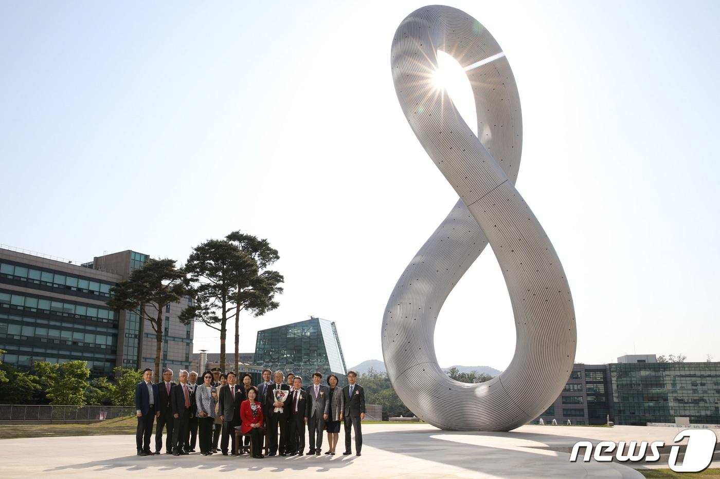 가천대 이길여 총장을 비롯한 보직자들이 9일 개교기념식을 마친 뒤 무한대상 조형물 앞에서 기념촬영을 하고 있다.(가천대 제공) ⓒ News1 김평석 기자